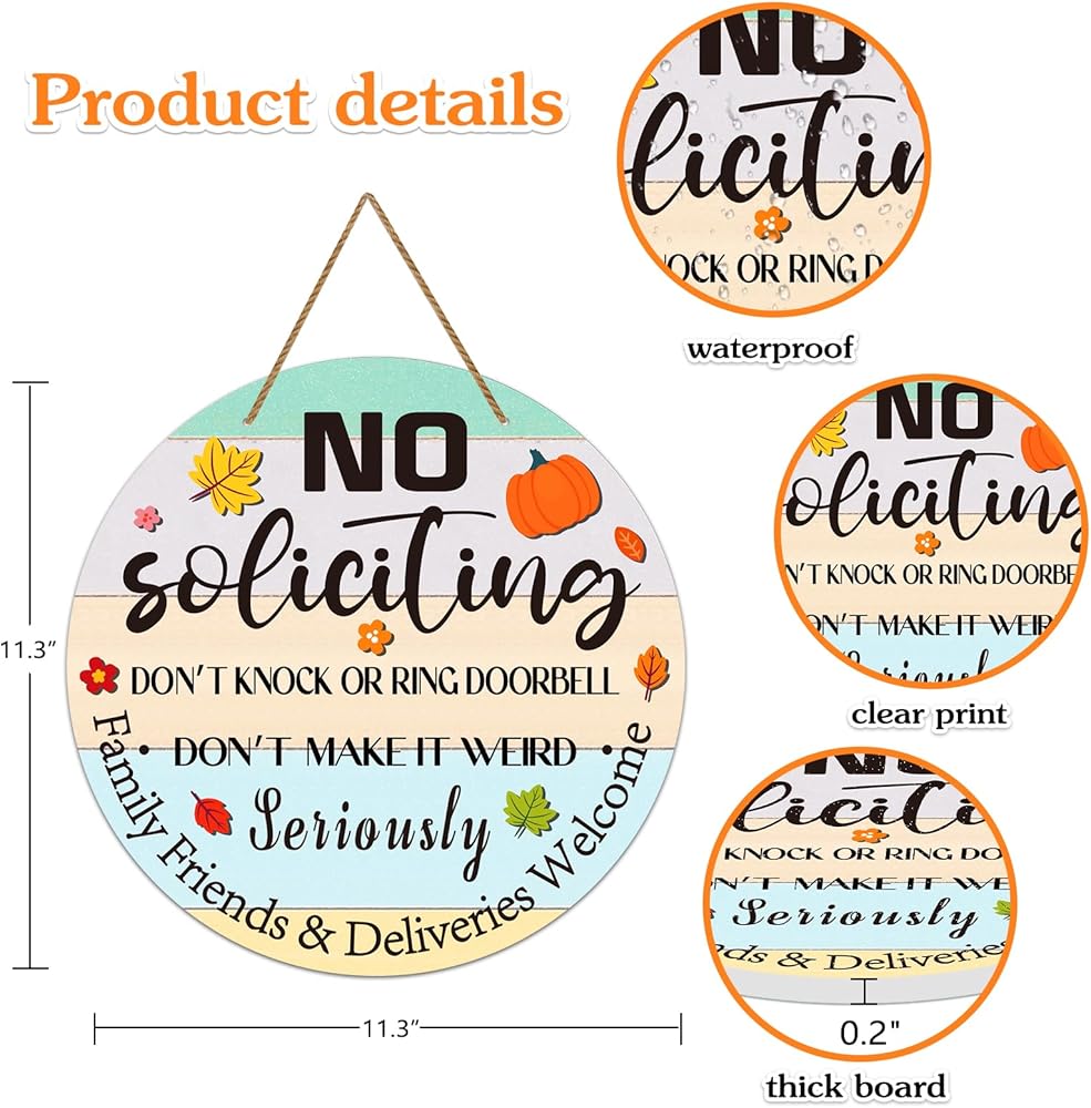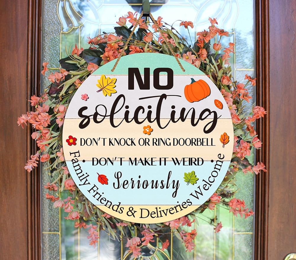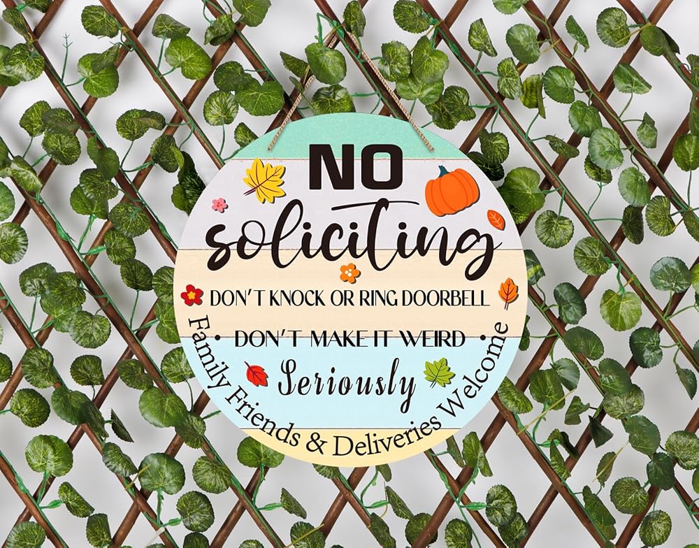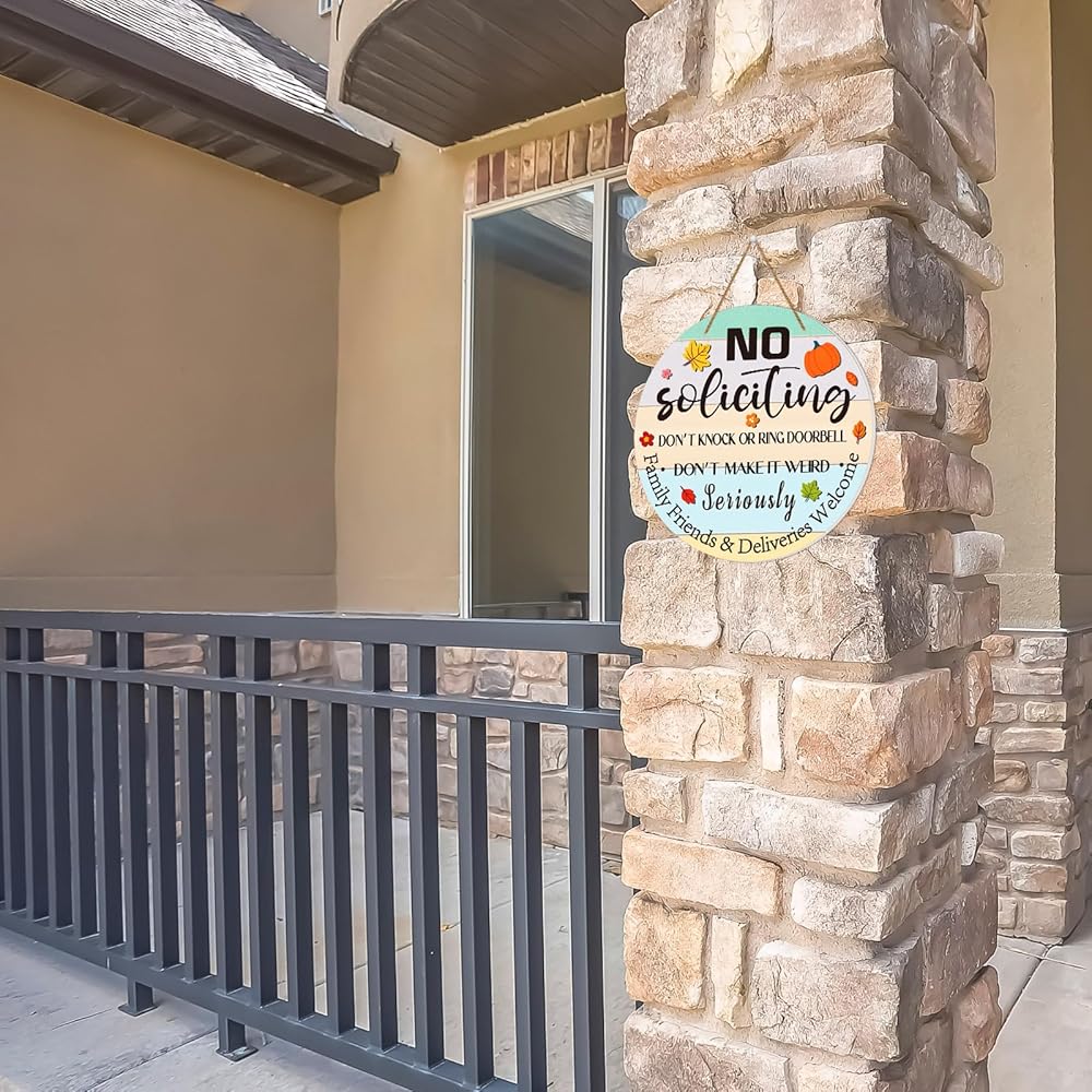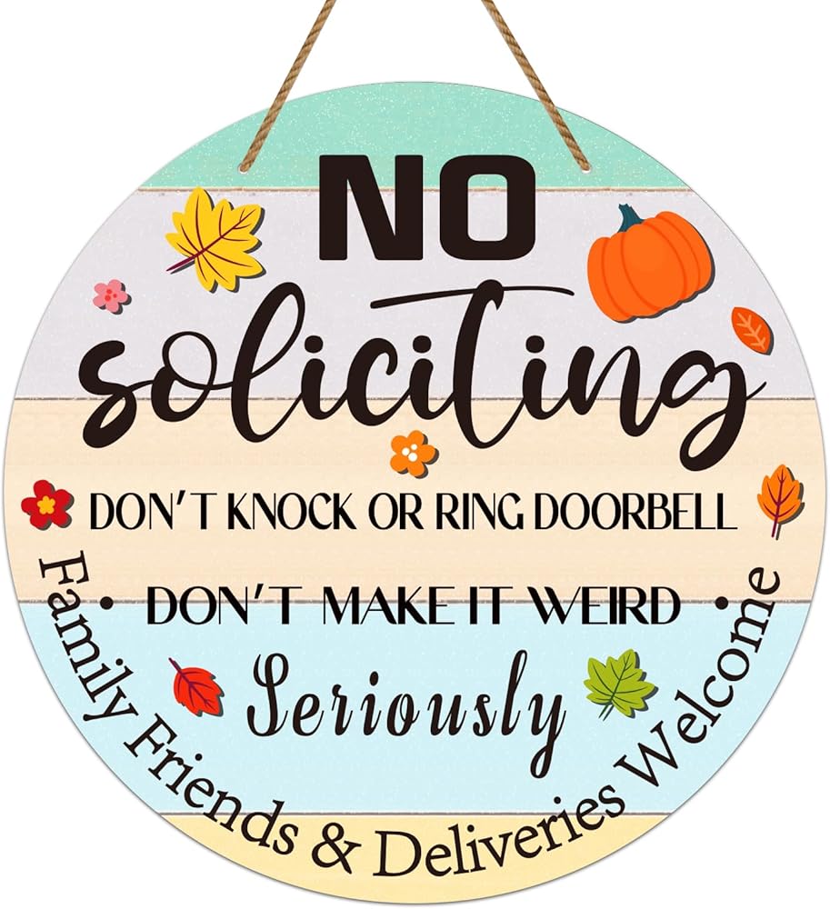 • FUNNY NO SOLICITING SIGN FOR HOUSE HOME: Features funny words ''No Soliciting do not knock or ring doorbell seriously do not make it weird family friends & deliveries welcome'', place it on your front door doorbell, adds a touch of humor to your front door, and remind the people don't knock the door or don not ring the doorbell, keep solicitors and unwanted visitors away from your house home