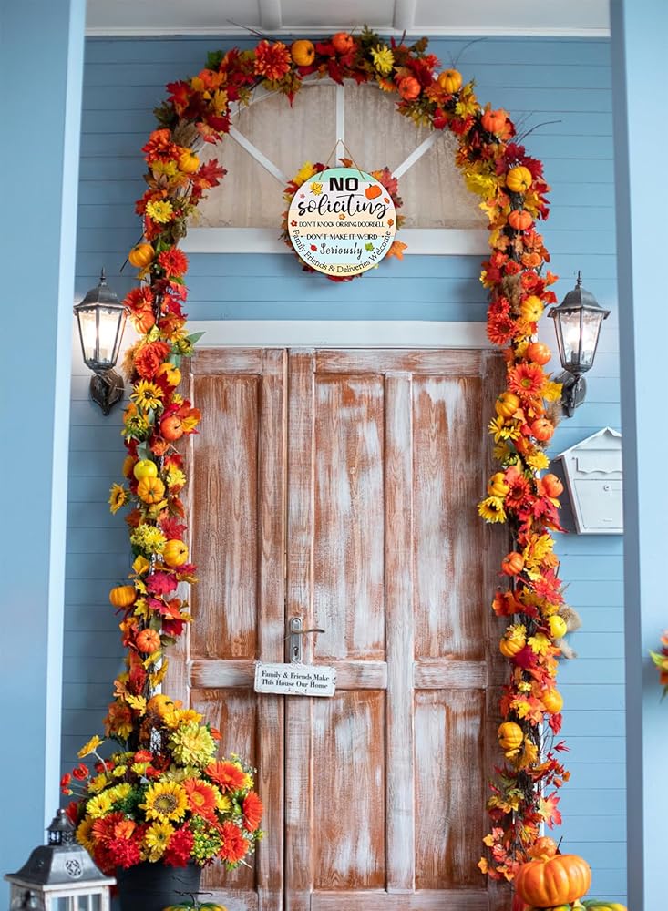 • NO SOLICITING SIGN FOR FRONT DOOR DECORATIONS: Farmhouse fall maple leaf pumpkin design, looks very beautiful and attractive, adds a charming and decorative touch to your front door and enhancing the overall aesthetic appeal of your home, great farmhouse no soliciting decor sign for home fall autumn front door wreath wall window porch decorations