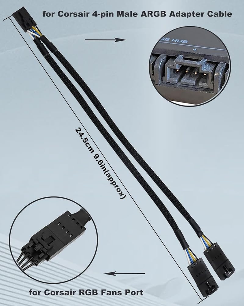compatible with Corsair RGB fans,such as HD120 and HD140 RGB, SP120 and SP140 RGB PRO and ELITE, ML120 and 140 PRO RGB, LL120 and LL140, QL120 and QL140. This adapter will only work with iCUE version 4.16 or later, Commander CORE firmware version 2.6.201 or later, and iCUE Commnader CORE XT firmware version 1.0.29 or later. Specification: Connector A: 4 Pin Corsair RGB male connector plug into Corsair 4Pin Male ARGB adapter cable Connector B: Dual 4 pin fan female connectors plug intoplug into the standard 5V 3Pin ARGB devices. Length: 24cm / 9inch