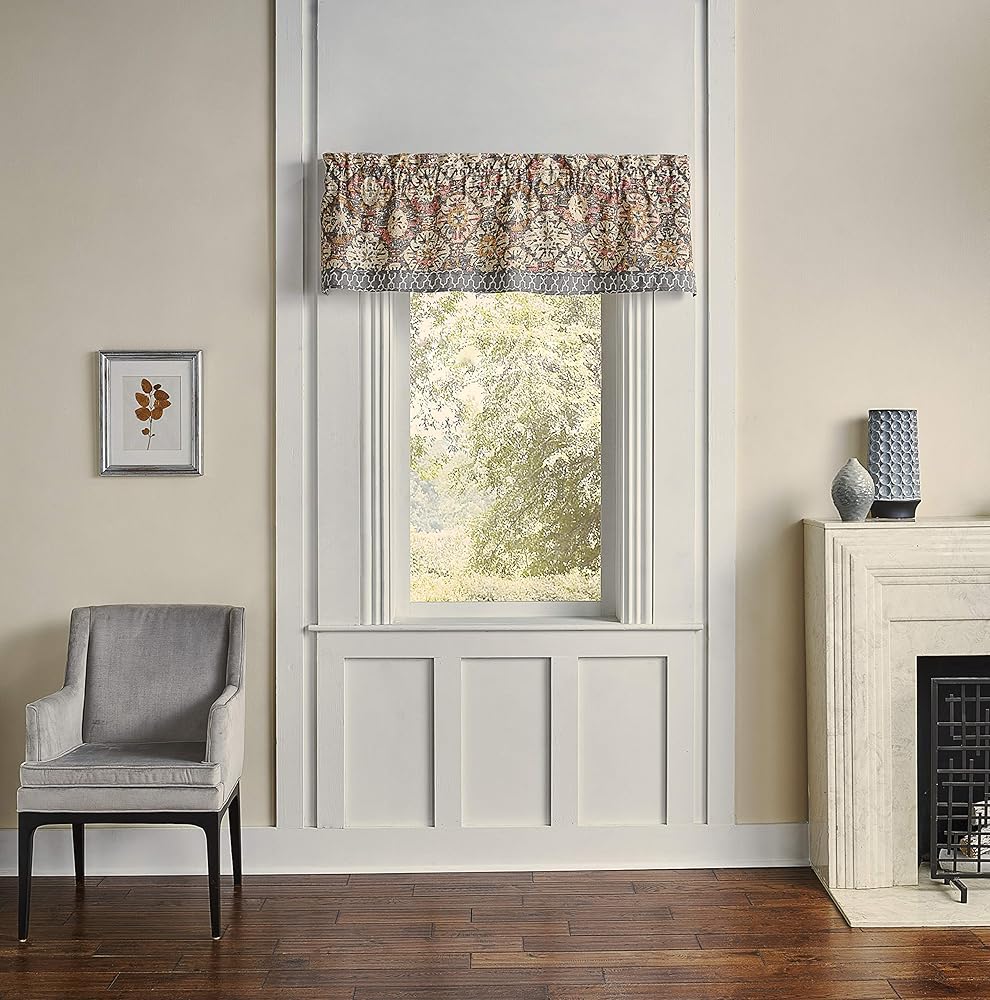 Refresh any room in your home with classically elegant window treatments by Waverly. This lovely valance features an allover medallion tile pattern in warm blush, taupe, and grey earth tones with a coordinating trellis pattern decorative trim. Lined valance measures 60" wide x 16" long. Hang coordinating panels and valance on standard or decorative curtain rod. 3 inch rod pocket is recommended with up to a 1.5 inch rod for maximum movement. 2 inch header adds decorative style. Curtain rod sold separately. Coordinating Waverly Craft Culture quilt set, accent pillows and drapery pair sold separately. 100% cotton with cotton lining. Machine washable.