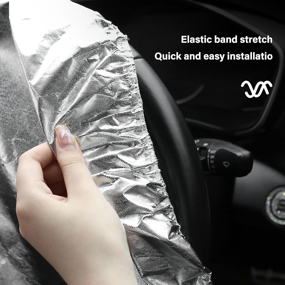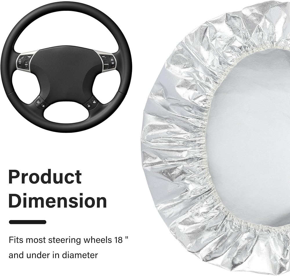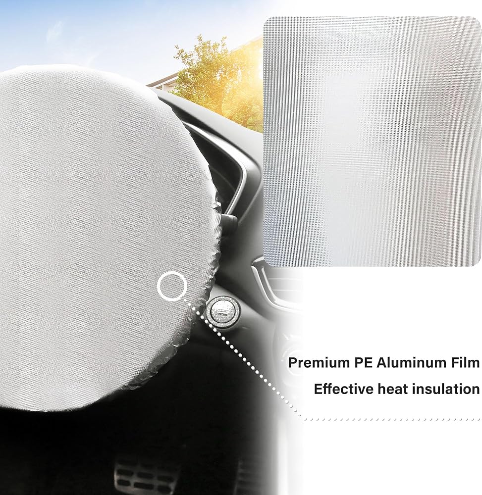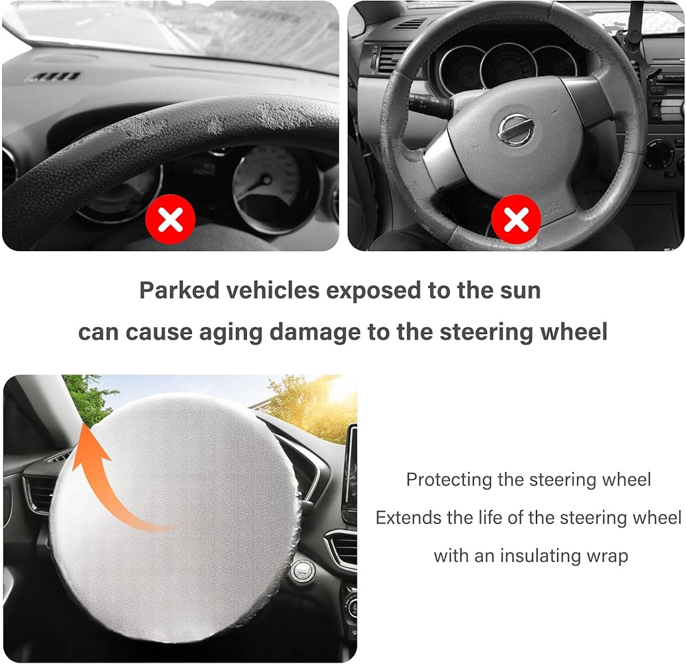 💛 EFFECTIVE SUNSHINE PROTECTION: Our steering wheel protector is made of quality PE aluminum film material, which is heat-insulating and can reflect most of the sunlight, thus providing effective sun protection. It can also reduce the temperature rise and keep the car cool. It has a longer service life and is not easily affected by strong wind, rain, snow and other natural environments.