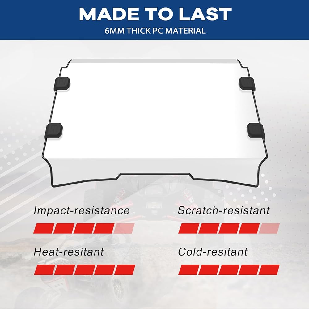 【مقاوم للخدش】الزجاج الأمامي الكامل PRO R Font الخاص بنا مصنوع من البولي كربونات المتين والمقاوم للكسر، بسمك 6 مم لضمان الاستخدام طويل الأمد. مغطى من الداخل والخارج بمقاومة للخدش يحافظ على رؤية واضحة تمامًا حتى في التضاريس الصعبة، مما يسمح لك بالاستمتاع بالمغامرة دون أي إلهاء.