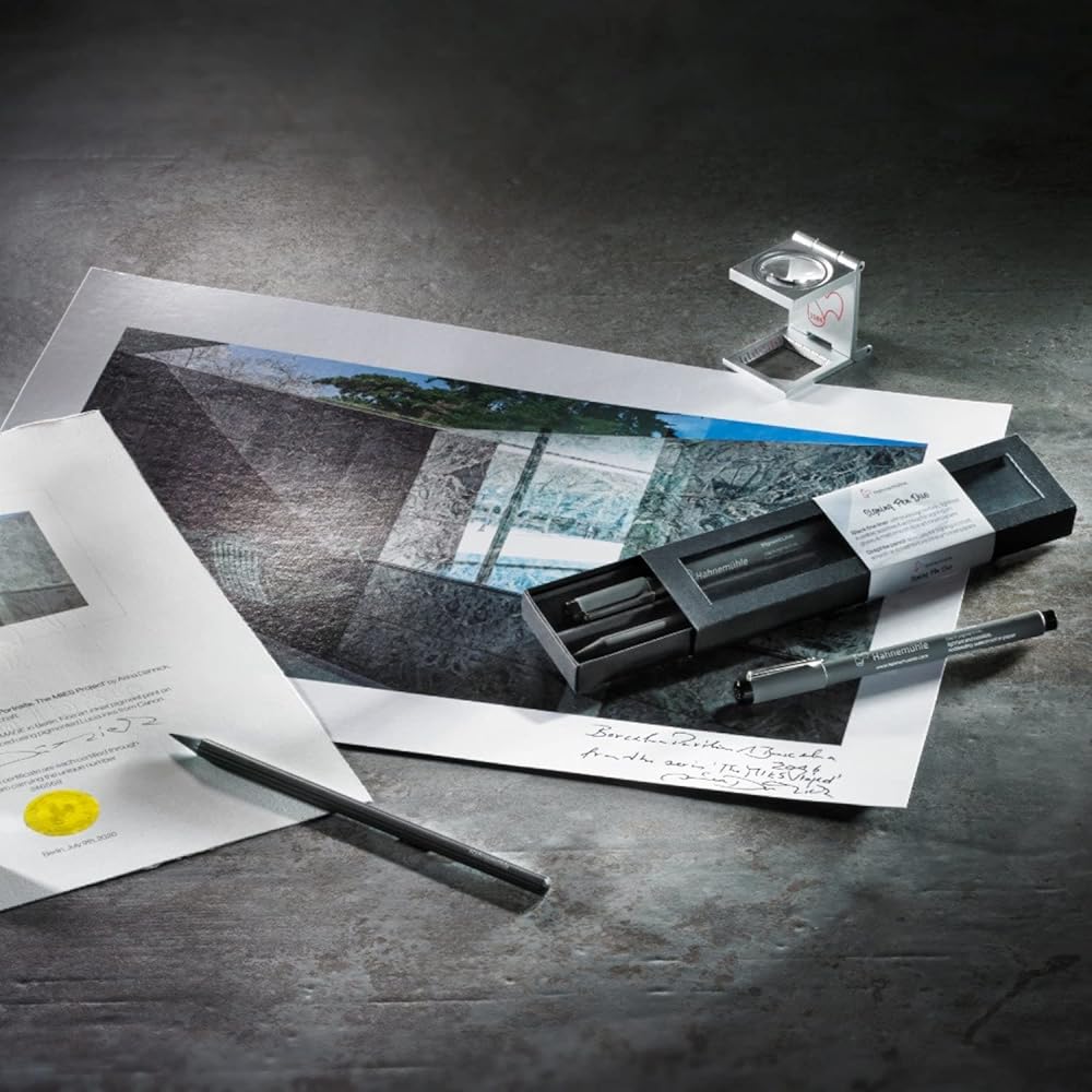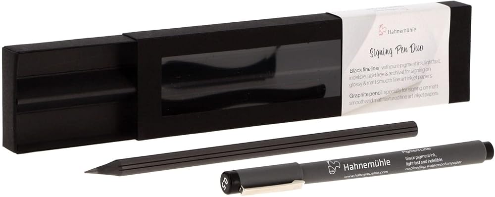 The Hahnemühle signature pencil and pen help artists add an even more personal touch to their works and highlight limited editions and give a perfect finish to unique and unique pieces. With the classic black pigmented ink fine point pen, it is possible to sign easily, especially on highly glossy paper surfaces, without the signature tarnishing or transferring itself. Fineliner pen ink is permanent, odorless, water and light resistant, and is suitable for archiving. Its refined metallic tip allows for even the most detailed signatures. In order to also ensure the originality of images printed on matte and textured paper, the pigment pen is accompanied by a high-quality black graphite pencil that is suitable for archiving. The noble quality pencil is at the same time soft enough to not have to be pressed onto the paper and rigid enough to get a readable signature. The Hahnemühle signature pen and pencil match perfectly with the Hahnemühle Certificate of Authenticity, ensuring the authenticity of limited edition artwork and reproductions, Protecting them from counterfeits.