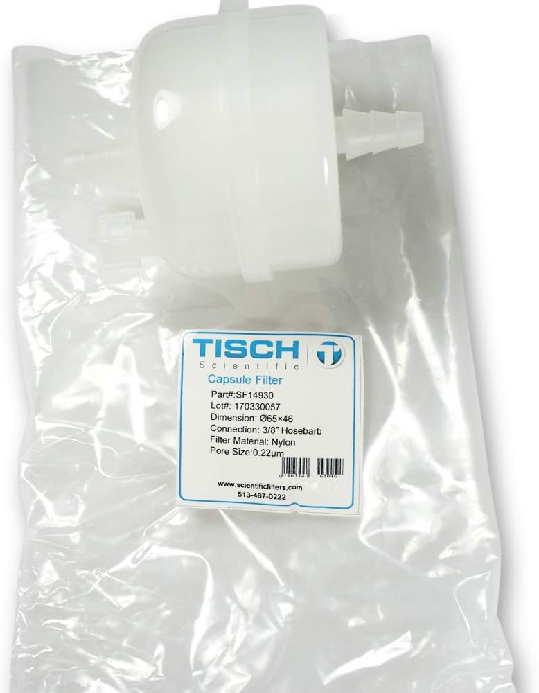 Tisch Brand SF14930 Nylon Capsule Filters, 0.22um, 65mm x 46mm, 3/8 inch hosebarb connections, 1/pk/1 per pack | Wettability: Hydrophilic | Filtration Area: 527 (cm2) |