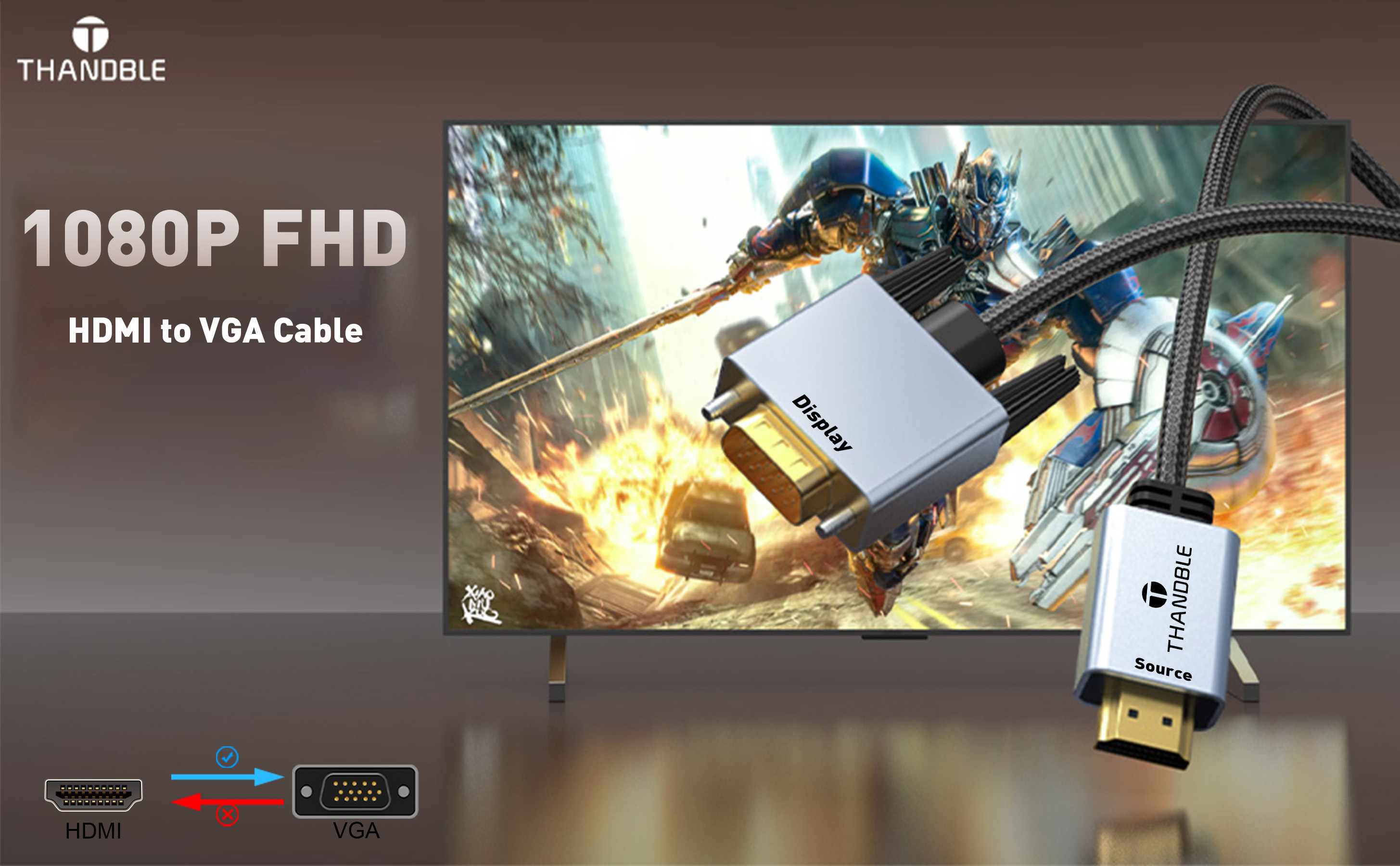 متوافق على نطاق واسع: محول THANDBLE HDMI إلى VGA، شريحة IC متقدمة مدمجة، يحول إشارات HDMI الرقمية إلى إشارات تناظرية VGA، متوافق مع الكمبيوتر الشخصي، سطح المكتب، الكمبيوتر المحمول، Chromebook، Raspberry Pi، Intel Nuc، Roku، PS3، Xbox One، Xbox 360 أو Wii U أو جهاز فك التشفير أو صندوق التلفزيون أو الأجهزة الأخرى المزودة بمنفذ HDMI. مناسب لجميع الشاشات وأجهزة التلفزيون وأجهزة العرض المزودة بمنافذ VGA (15 سنًا) (ملاحظة: إنه ليس محول ثنائي الاتجاه ولا يمكنه نقل إشارة VGA إلى HDMI.)