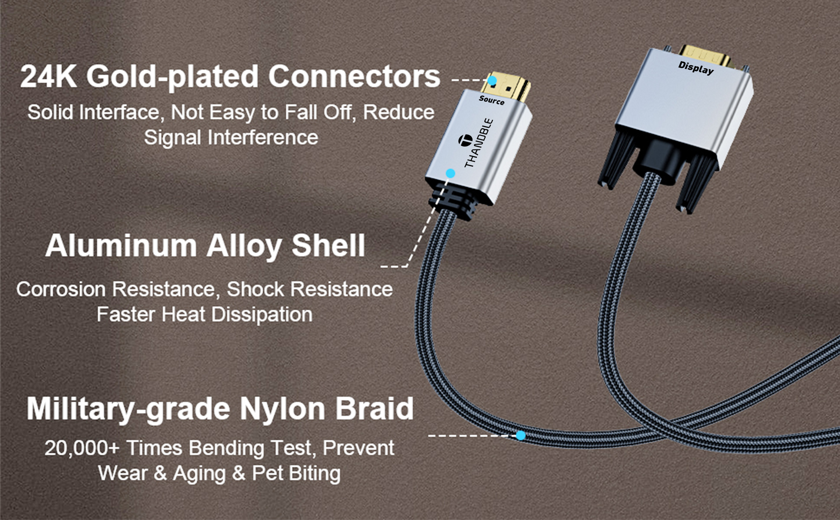 أعلى أداء في الصناعة: كابل HDMI إلى VGA، يدعم دقة تصل إلى 1920x1080@60 هرتز (1080p Full HD)، متوافق مع الإصدارات السابقة مع 1600x1200، 1280x1024، 1024x768، 800x600، و720p لشاشات LCD وLED عالية الدقة. (ملاحظة: يدعم فقط نقل إشارات الفيديو، وليس نقل الصوت.)