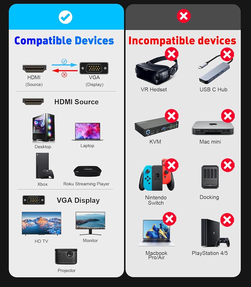 ملاحظة هامة: كابل محول HDMI إلى VGA هذا هو محول في اتجاه واحد لا ينقل إشارات VGA إلى HDMI. وهو غير متوافق مع مشغلات Blu-ray والأجهزة ذات منافذ HDMI منخفضة الطاقة، مثل SONY PS4، Apple MacBook Pro مع شاشة Retina، وMac mini، وApple TV. أجهزة HDMI منخفضة الطاقة.