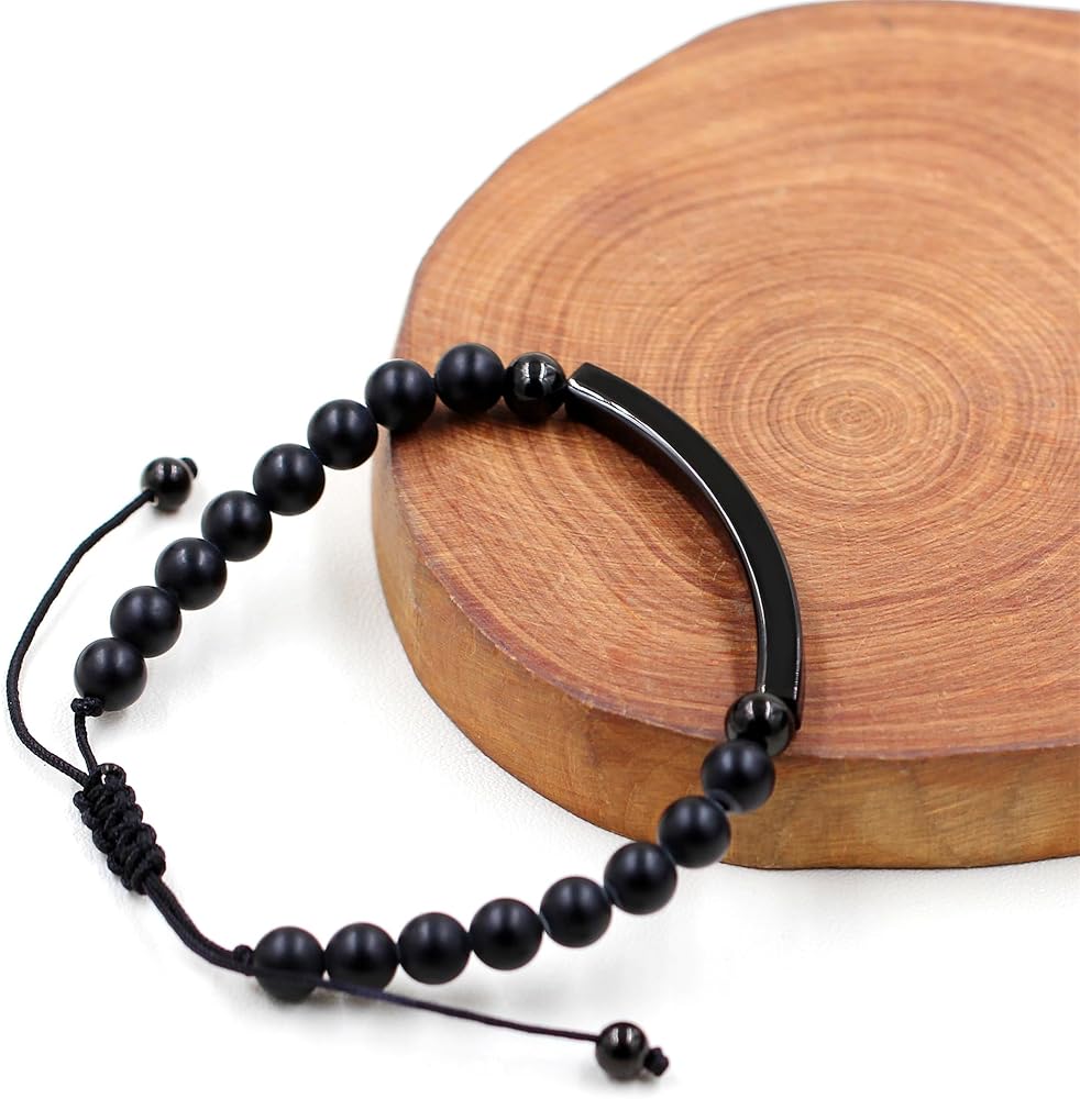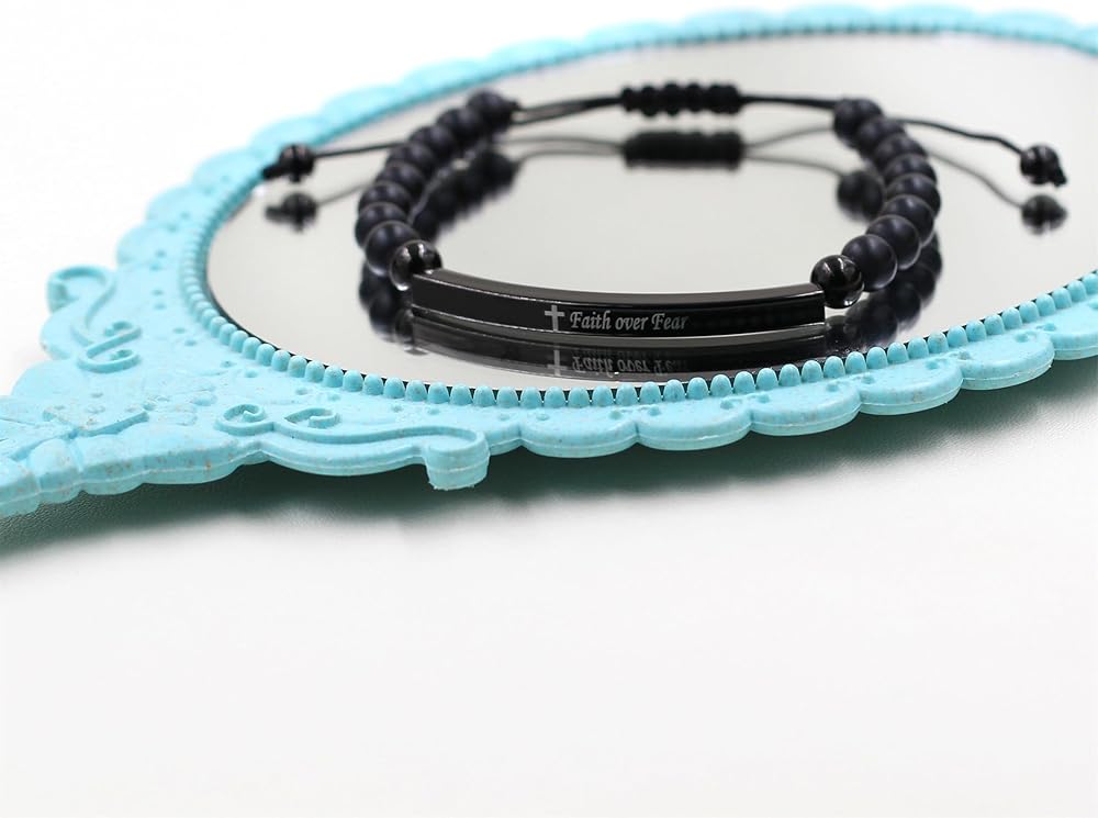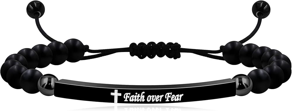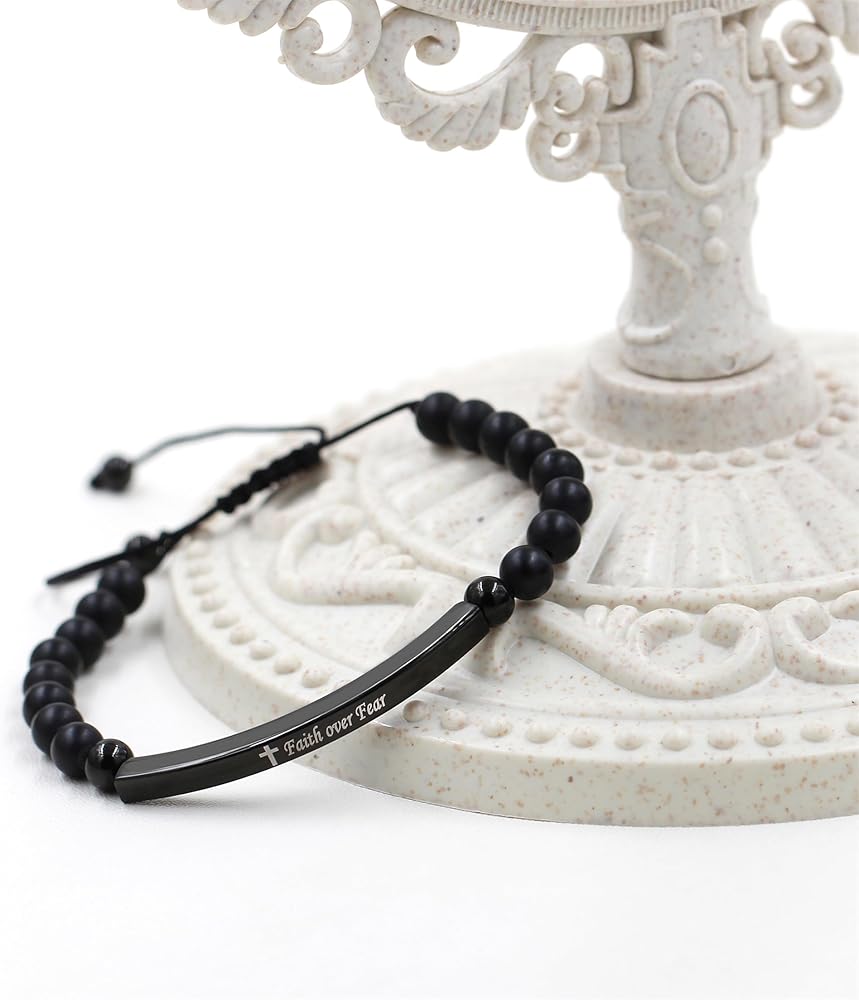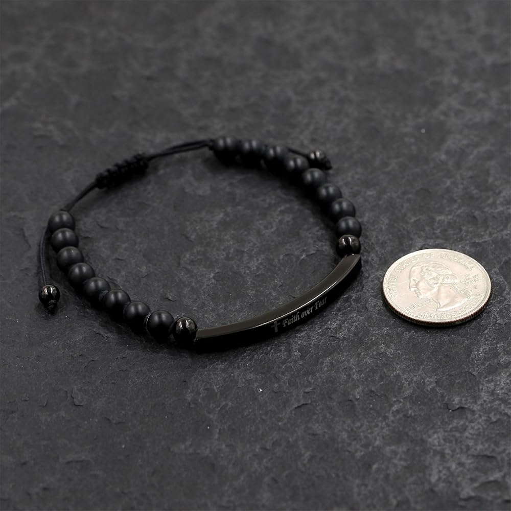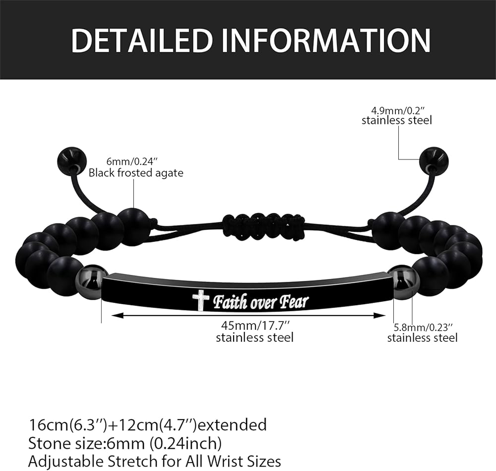 ♥ Black and white agate beading with adjustable weaving, engraved with the words "Faith Over Fear".Elevate your style with this stunning adjustable agate beaded bracelet featuring a unique design of a cross symbol and the engraving "Faith conquers fear".