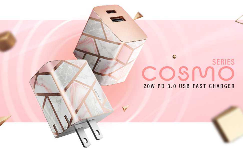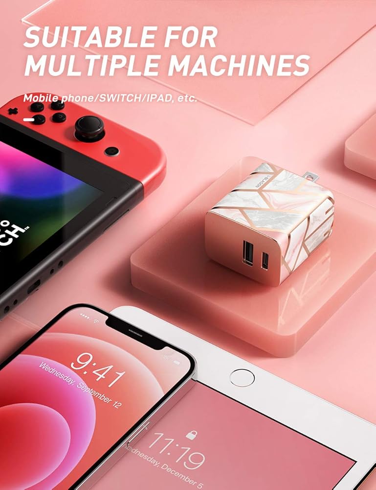 شاحن حائط i-Blason سريع USB C، محول طاقة مدمج 20 وات PD 3.0 USB قابل للطي مع منفذين متوافق مع iPhone 15/ iPhone 14/iPhone 13/MagSafe Charger/iPad/Samsung Galaxy S23 (رخام)