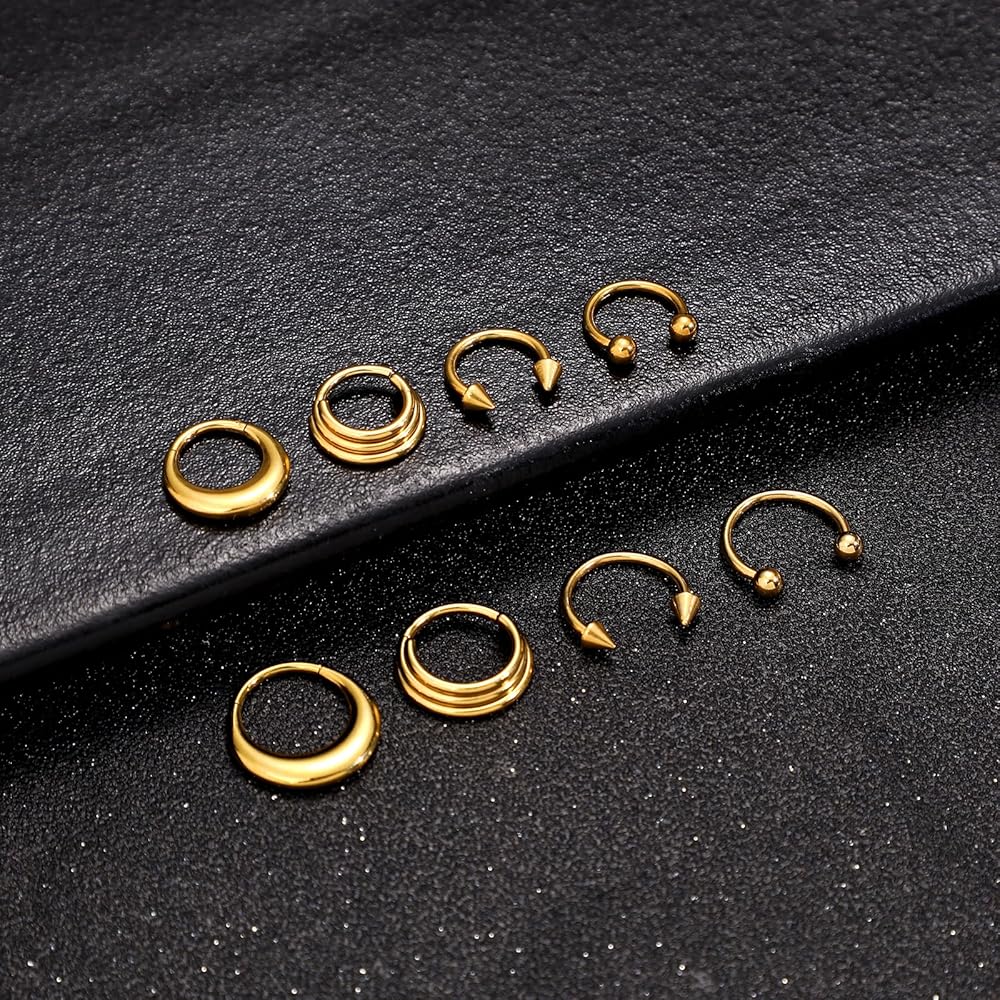 أنماط متعددة من حلقات الأنف: تتضمن مجموعة مجوهرات الحاجز هذه 4 أنماط مختلفة من حلقات الأنف الفولاذية الجراحية لكل من الرجال والنساء. مقاسان (16G-8 مم، 10 مم) وألوان مختلفة حسب اختيارك، مناسب للمناسبات المختلفة للارتداء.