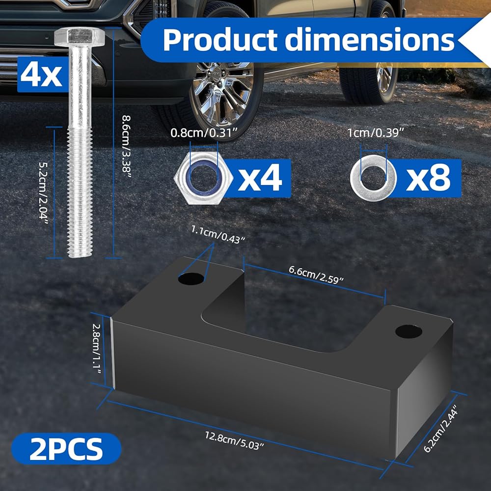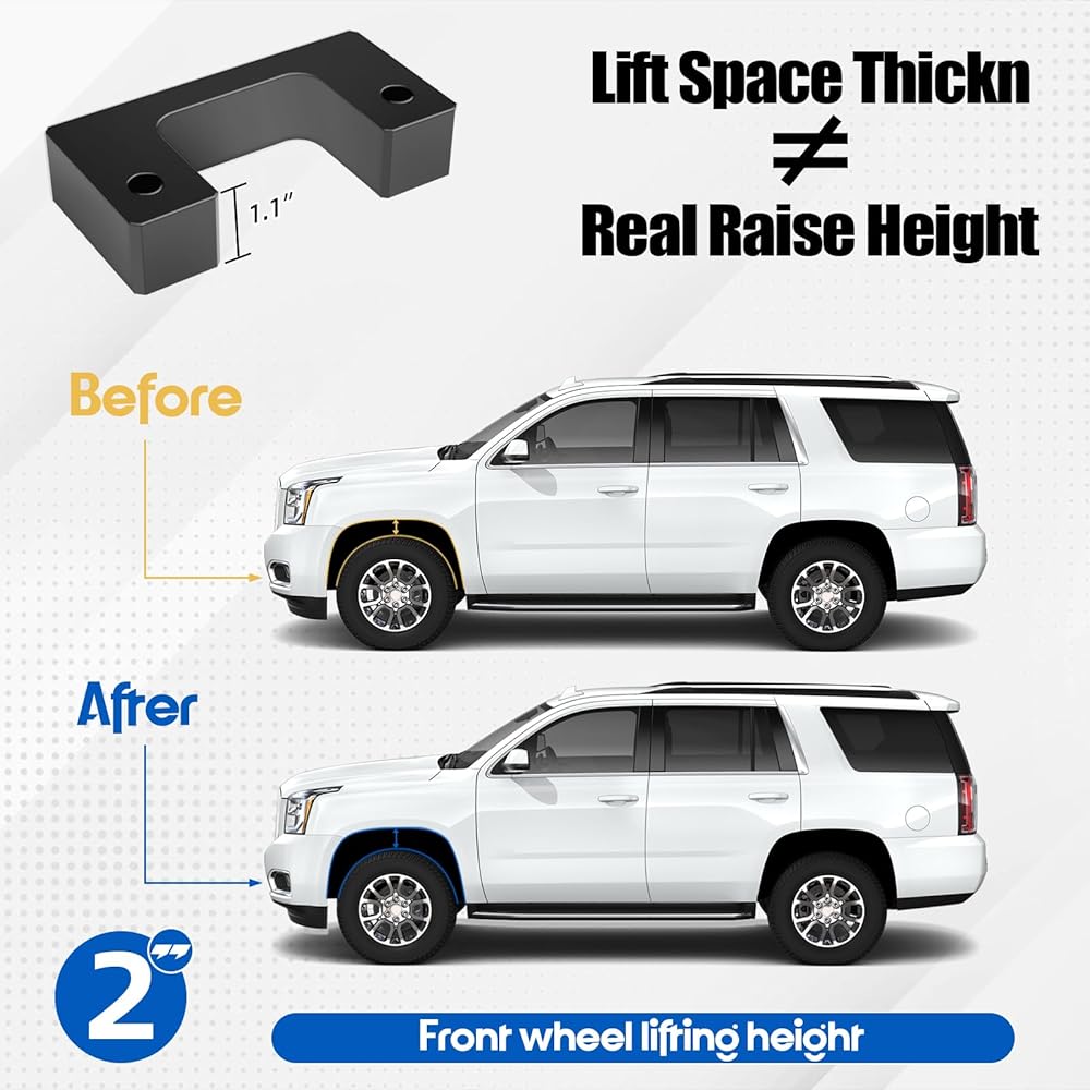 【مجموعة تسوية 2 بوصة】ستقوم مجموعة التسوية برفع الجزء الأمامي من شاحنتك بمقدار 2 بوصة، ونظرًا لهندسة التعليق، فإن النسبة بين ارتفاع الرفع وسمك المجموعة ليست 1:1.