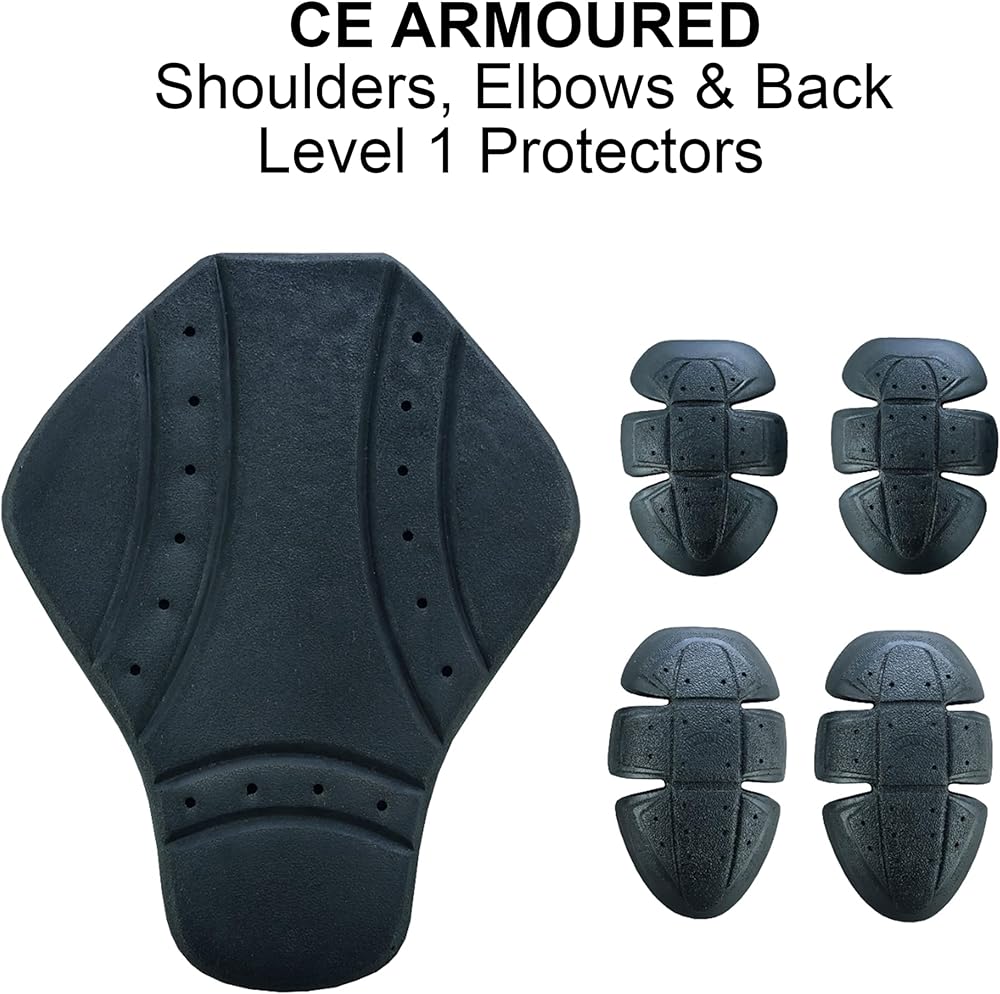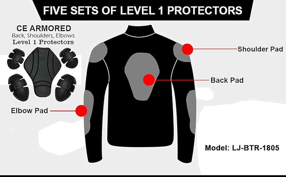 • الحماية المعتمدة من CE: المستوى 1 المعتمد من CE EN:1621-1-2012 وEN:1621-2-2014 واقيات الدروع المعتمدة على كتفين ومرفقين وظهر واحد تضمن سلامة لا مثيل لها أثناء رحلاتك.