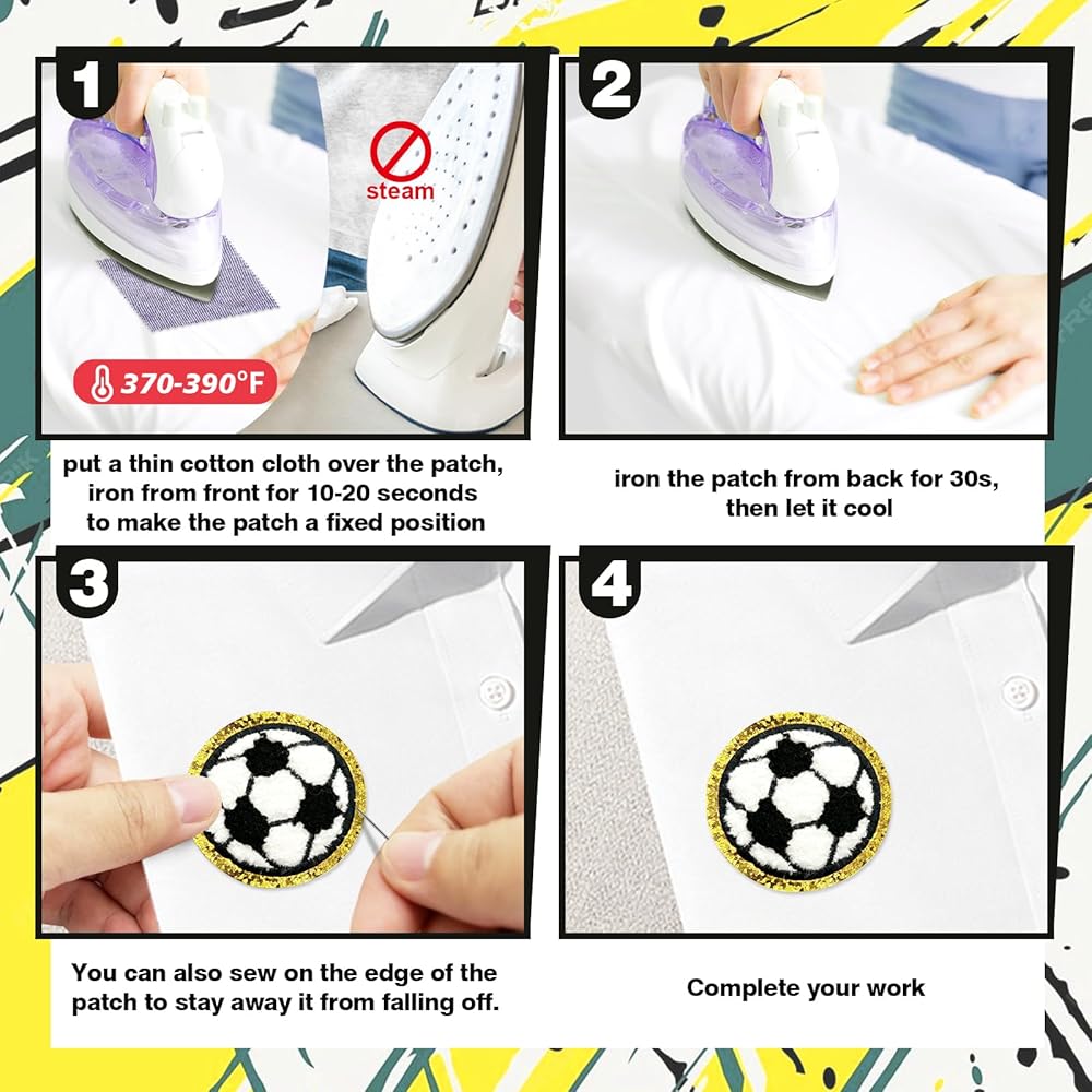 اضبط درجة حرارة المكواة إلى حوالي 370-390 درجة فهرنهايت (بدون بخار)، ضع قطعة قماش قطنية رقيقة فوق الرقعة، ثم قم بكيها لمدة 10-20 ثانية من مقدمة ملصق القماش لجعل ملصق القماش في وضع ثابت، ثم قم بكيها من الخلف لمدة 30 ثانية، ثم اتركها تبرد، أو قم بخياطتها على حافة الرقعة لجعلها أكثر ثباتًا.