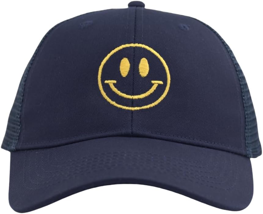 - الوجه المبتسم الأصفر الكلاسيكي مطرز على اللوحتين الأماميتين لقبعة البيسبول.