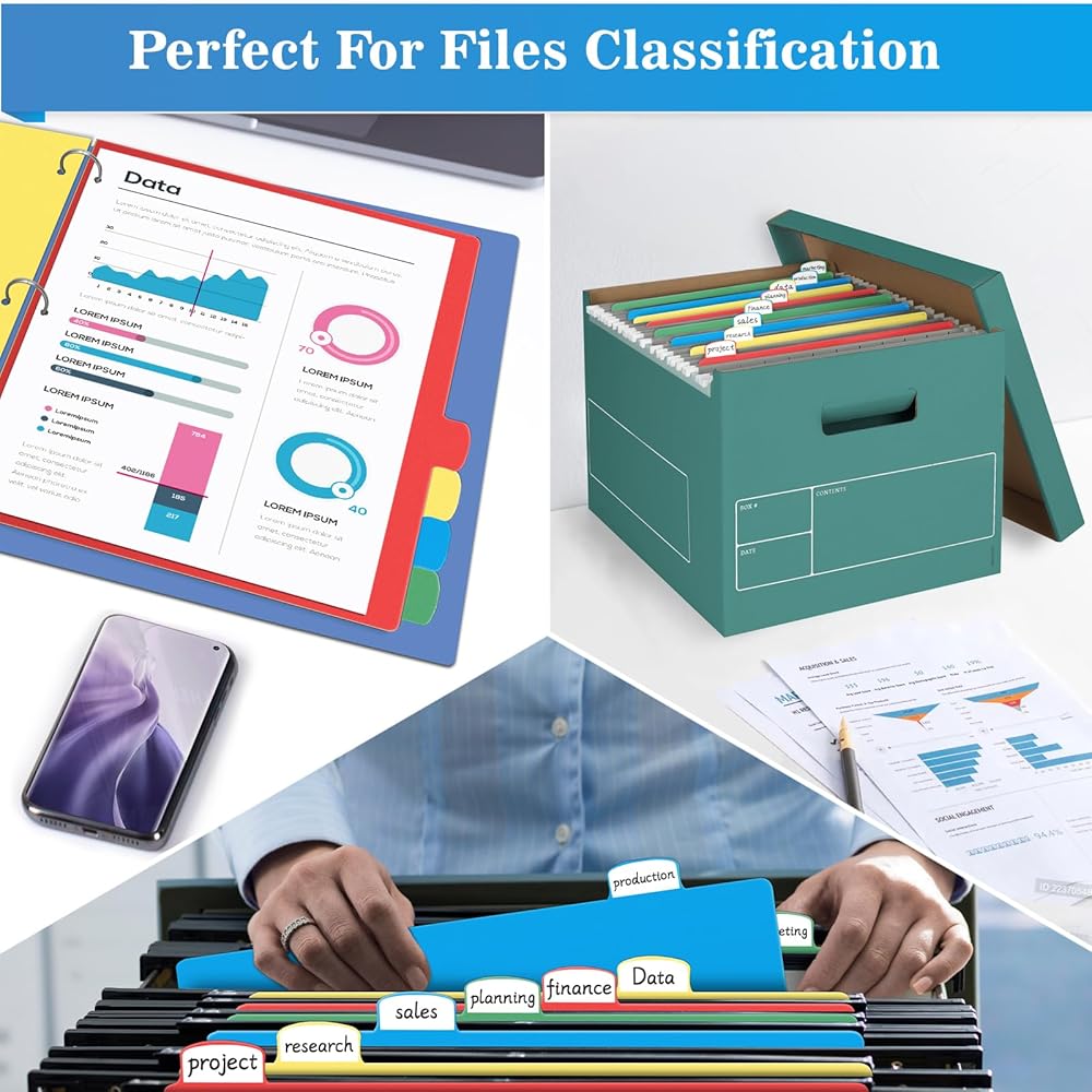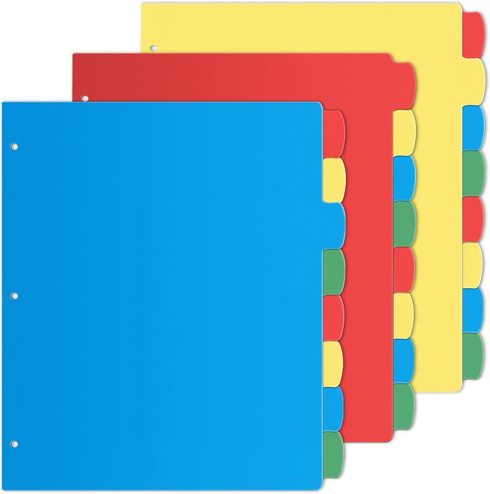 فواصل بلاستيكية مستخدمة على نطاق واسع - قم بفرز الملفات وتحديدها بسرعة وسهولة باستخدام فواصل المجلد هذه لإنشاء ملفات مخصصة أنيقة واحترافية. فواصل عالية الجودة مع عروات مصنوعة من بلاستيك طويل الأمد ومقاوم للتمزق وهو مناسب جدًا للعمل المدرسي والمشروعات المكتبية.