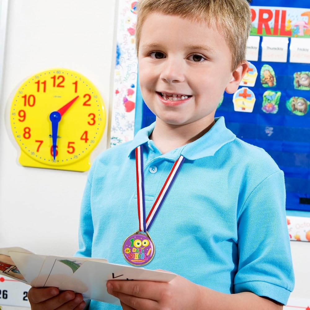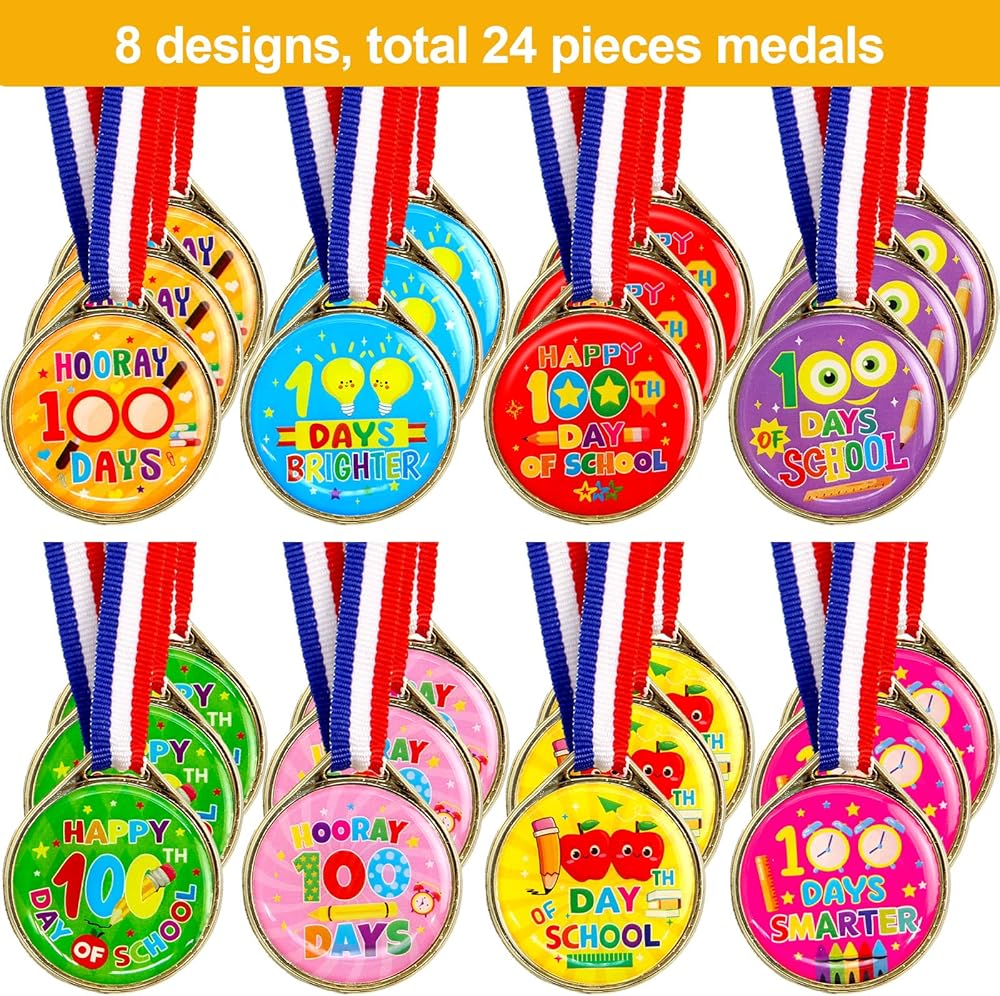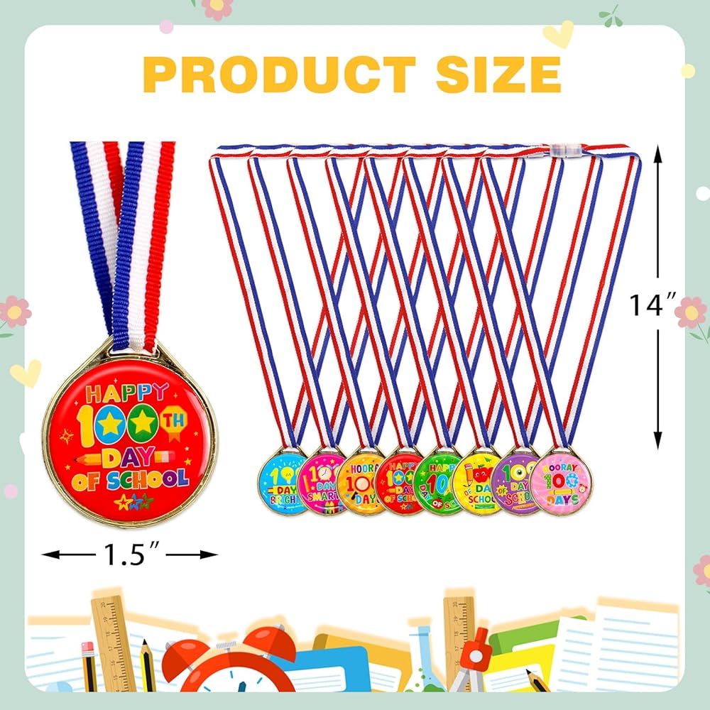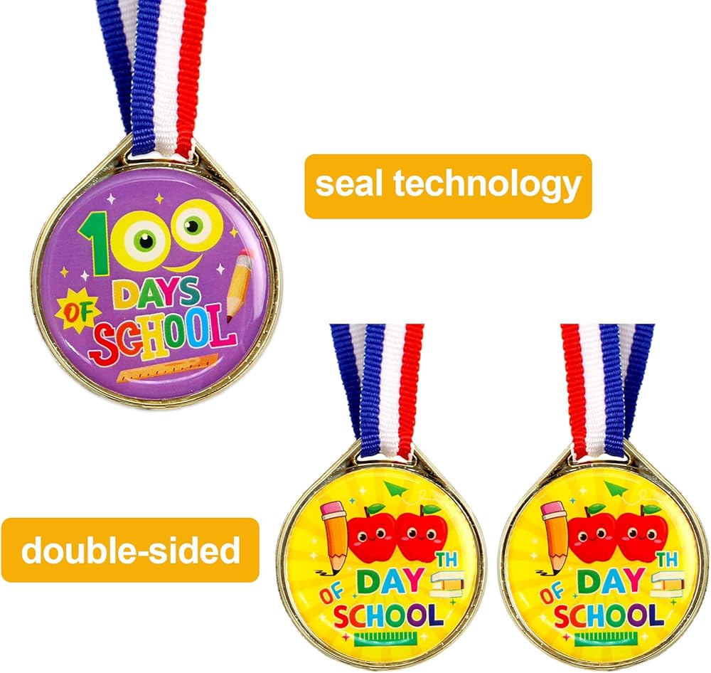 تشمل العبوة: 24 ميدالية لجوائز اليوم المائة من المدرسة للأطفال، 8 أنماط مختلفة، 3 قطع لكل نمط، تصميم على الوجهين.
