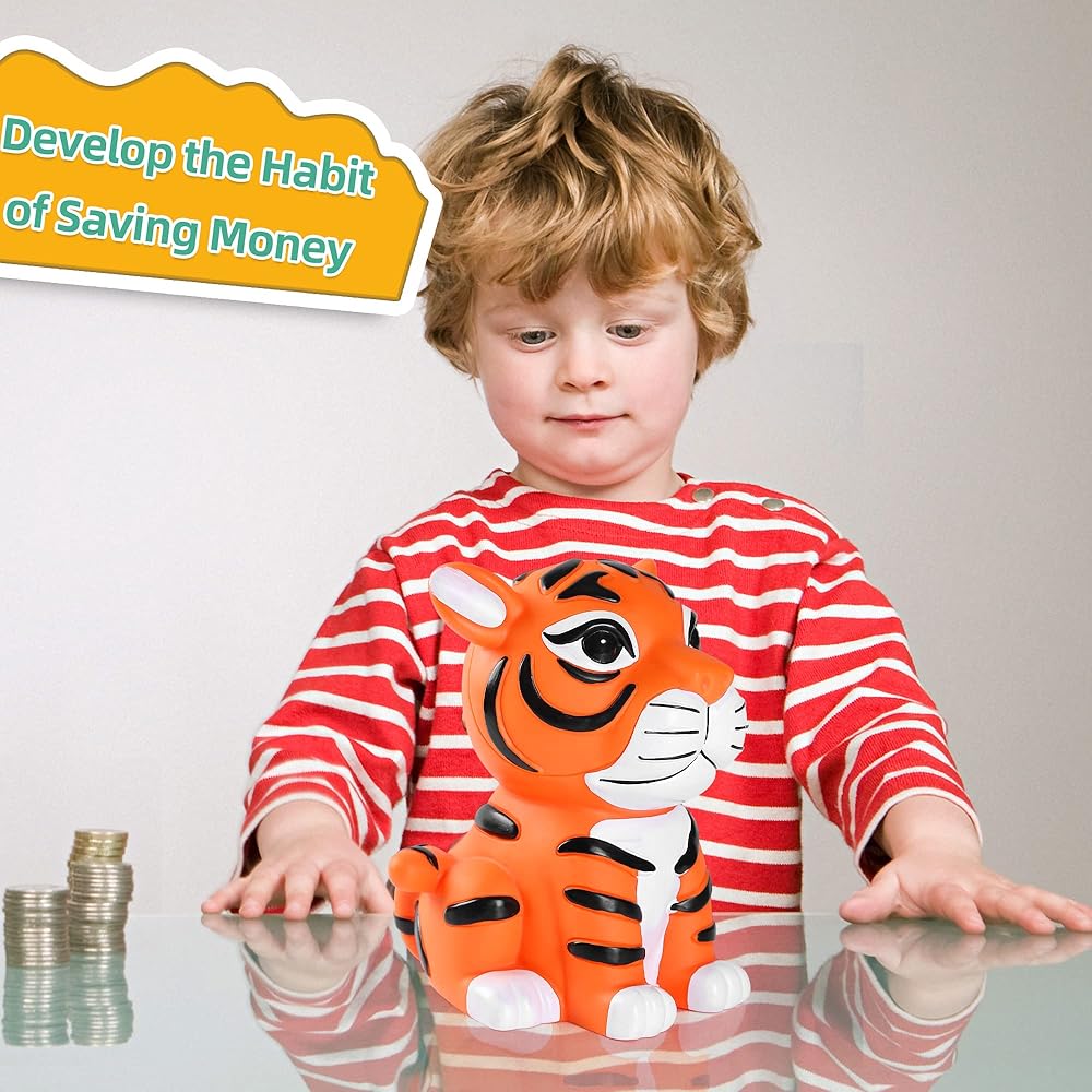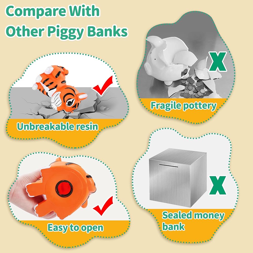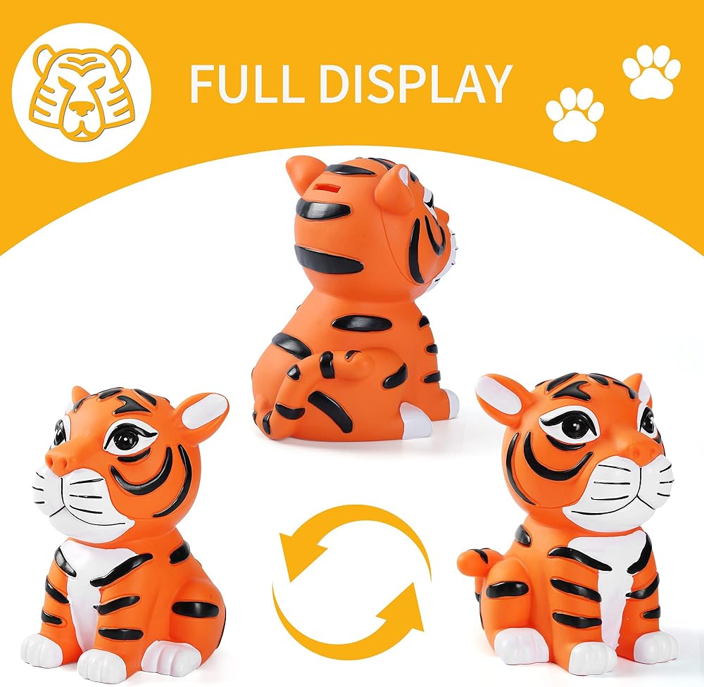 • 【MY FIRSR TIGER BANK】: A starter bank for young toddlers, start the saving process by adding cash to this cute tiger piggy bank. The tiger money box looks cute and attractive, kids will love placing money in this adorable coin bank friend and watching their savings grow, which also helps develop kids' good habits of saving money.