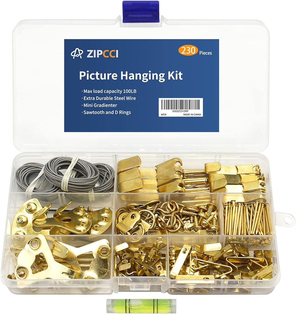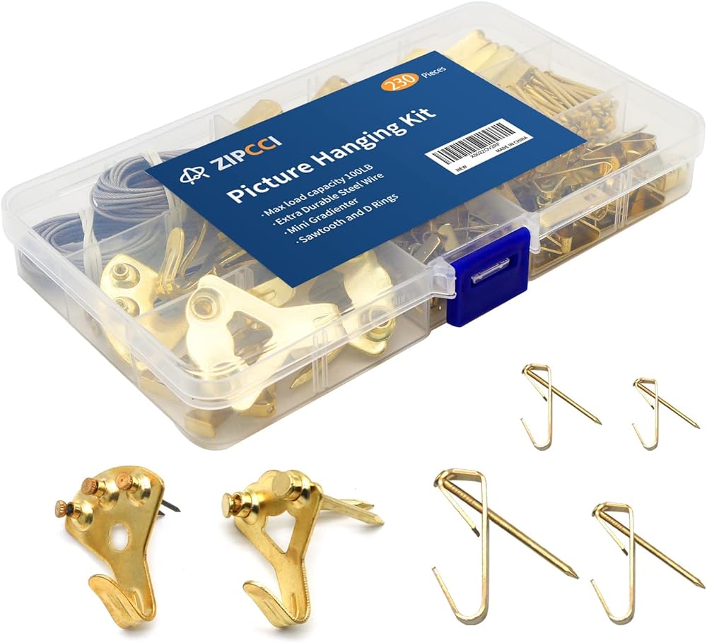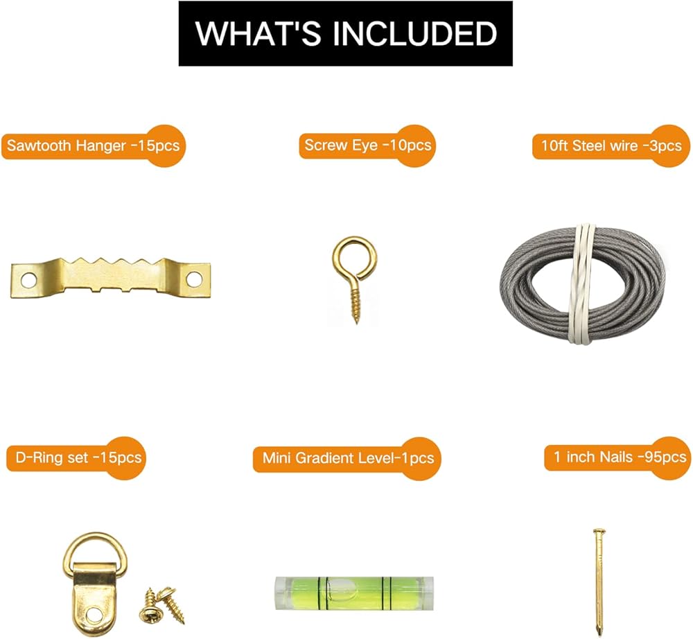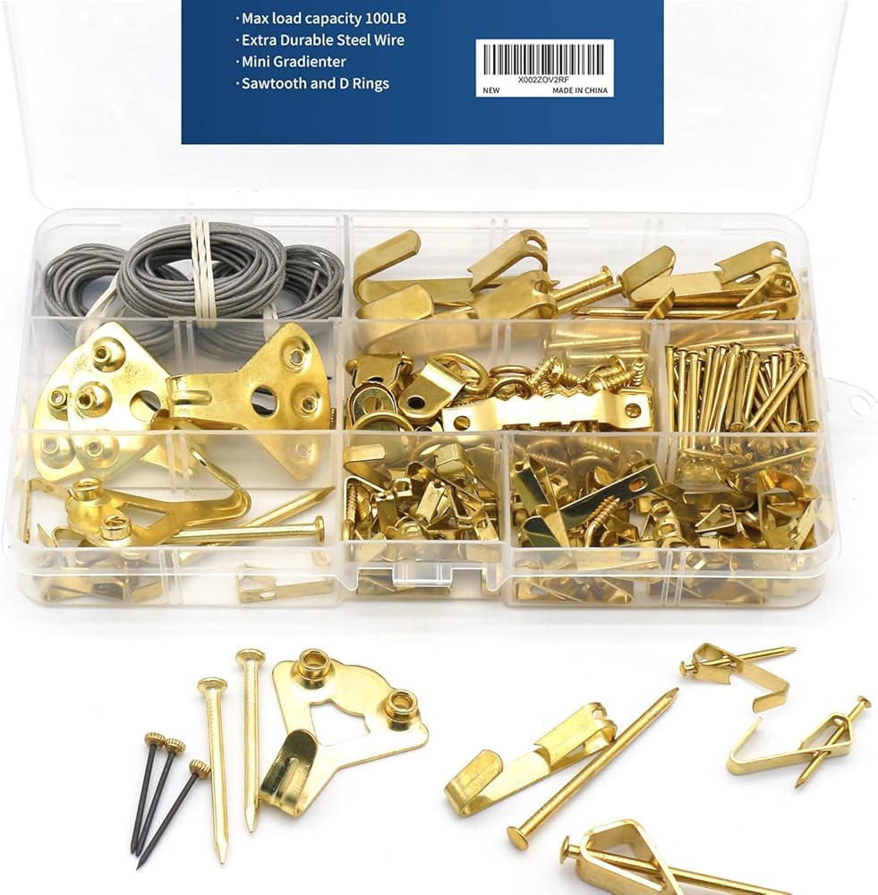 مجموعة تعليق الصور، 230 قطعة من شماعات الصور شديدة التحمل مع مسامير للتثبيت على الحائط، تتضمن سلك تعليق الصور، وسن المنشار، وخطافات التعليق، وحلقات على شكل حرف D، والمزيد من أجهزة تعليق الصور