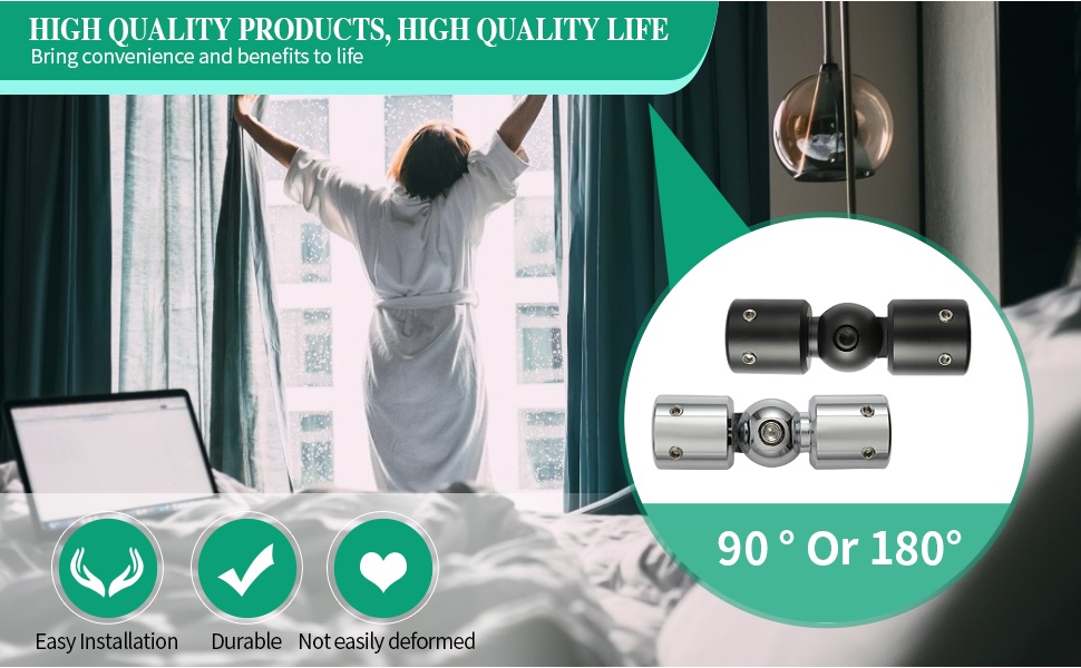 قوي ومتين، ومقاوم للصدمات والسقوط، وعصري وجميل. يمكنك اختيار موصل زاوية قضيب الستارة من الأسود والفضي، وهو مثالي لقضيب الستارة الخاص بك في نوافذ الخليج وقضبان النوافذ الزاوية.