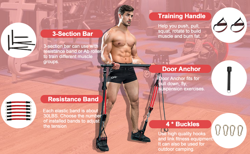 【 معدات اللياقة البدنية 3 في 1】: ليس فقط عصي البيلاتس، ولكن أيضًا يمكن دمجها بحرية في مجموعة متنوعة من الطرق المختلفة؛ المجموعة 1): شريط + أربطة مرنة + أشرطة للقدم = شريط بيلاتيس؛ مزيج. 2): مقابض + أشرطة مرنة = موسع الصدر؛ مزيج. 3): مرساة الباب + أشرطة مرنة + مقابض = حبل سحب الباب.