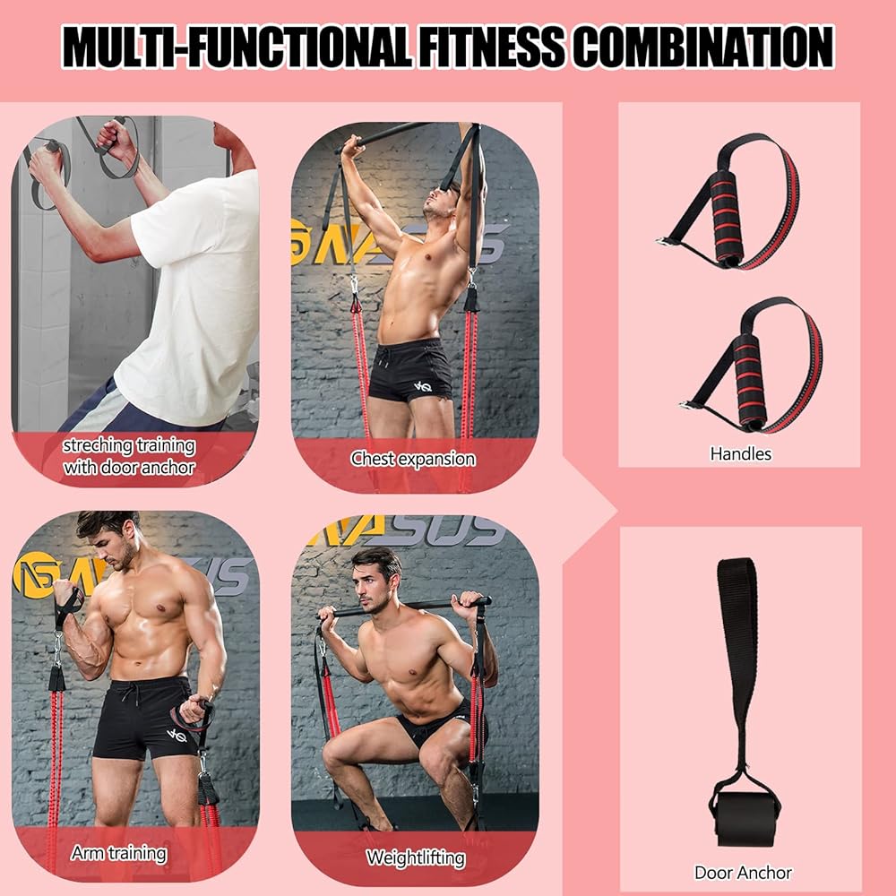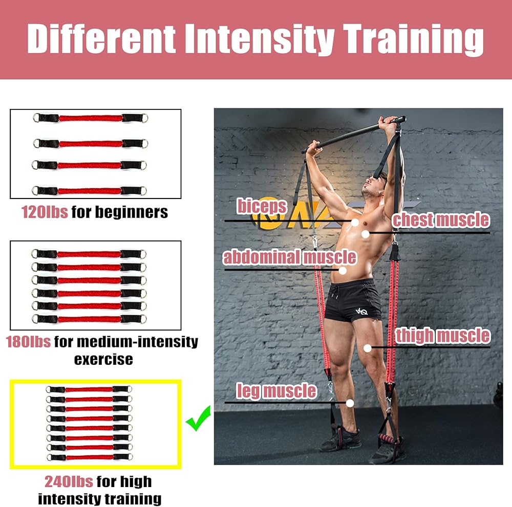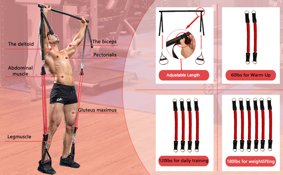 【 8 أشرطة مقاومة】: من 30 رطلاً إلى 240 رطلاً. يبلغ وزن كل شريط مطاطي حوالي 30 رطل، وهو قوي ومتين. يمكنك اختيار عدد الأشرطة المثبتة بحرية لضبط التوتر. الحبل قابل للتعديل. يمكنك ضبط طول الحبل وفقًا لطولك وكثافة التدريب.