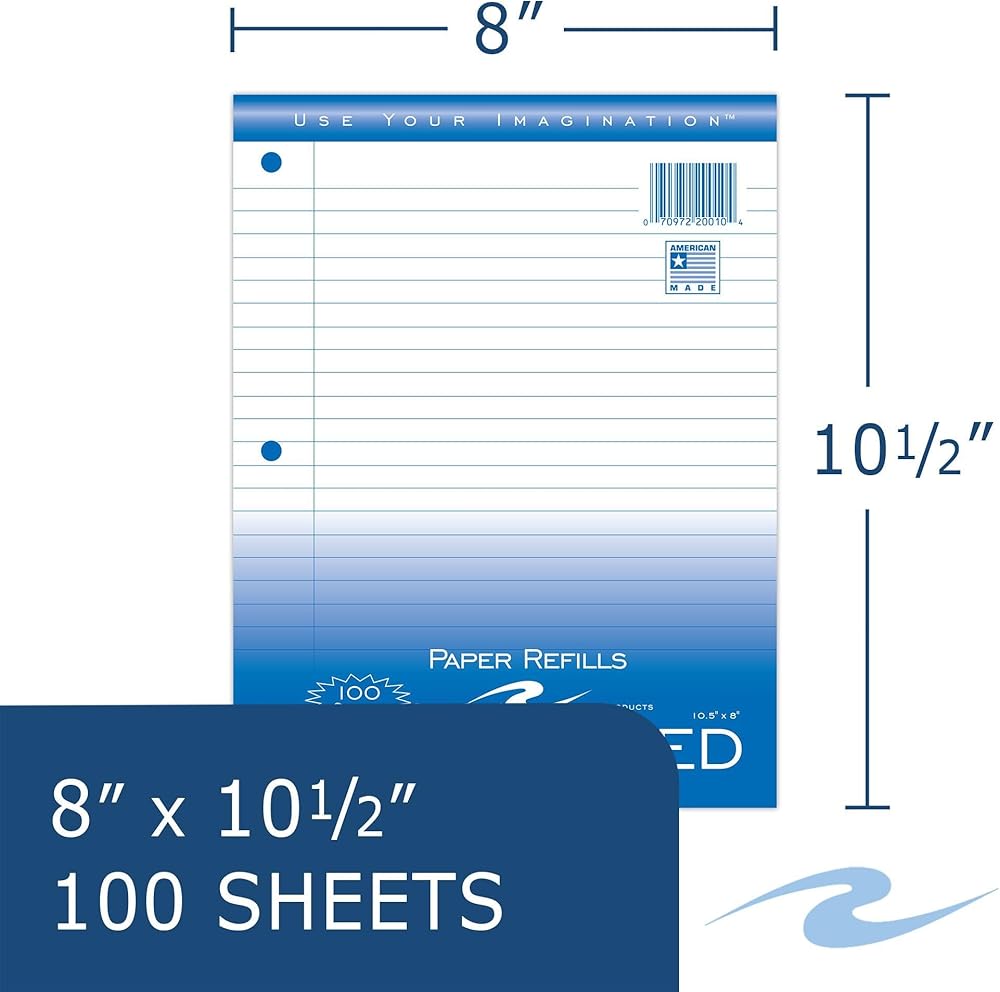 Founded in 1887 by D.M. Bare, Roaring Spring Paper Products has been an integral part of the Roaring Spring community for more that 130 years. Employing over 200 people, the company prides itself on remaining a family-owned, American small business. Looseleaf filler paper. Smooth, 15#, white writing paper. Each pack contains 100 wide ruled sheets with a red margin line. The paper is 10.5″ x 8″ and 3-hole punched. Polywrapped with a printed topsheet. Proudly made in the USA!