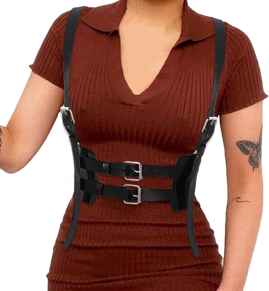 Women harness comes in a classic design -two shoulder straps with buckle,adds a little extra edge to so many different outfits.Harness belt offer a bold and edgy accessory choice that adds a unique flair to your ensemble.