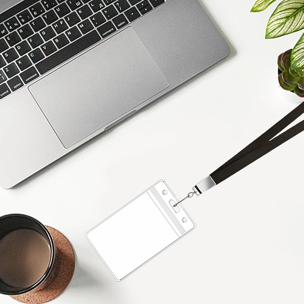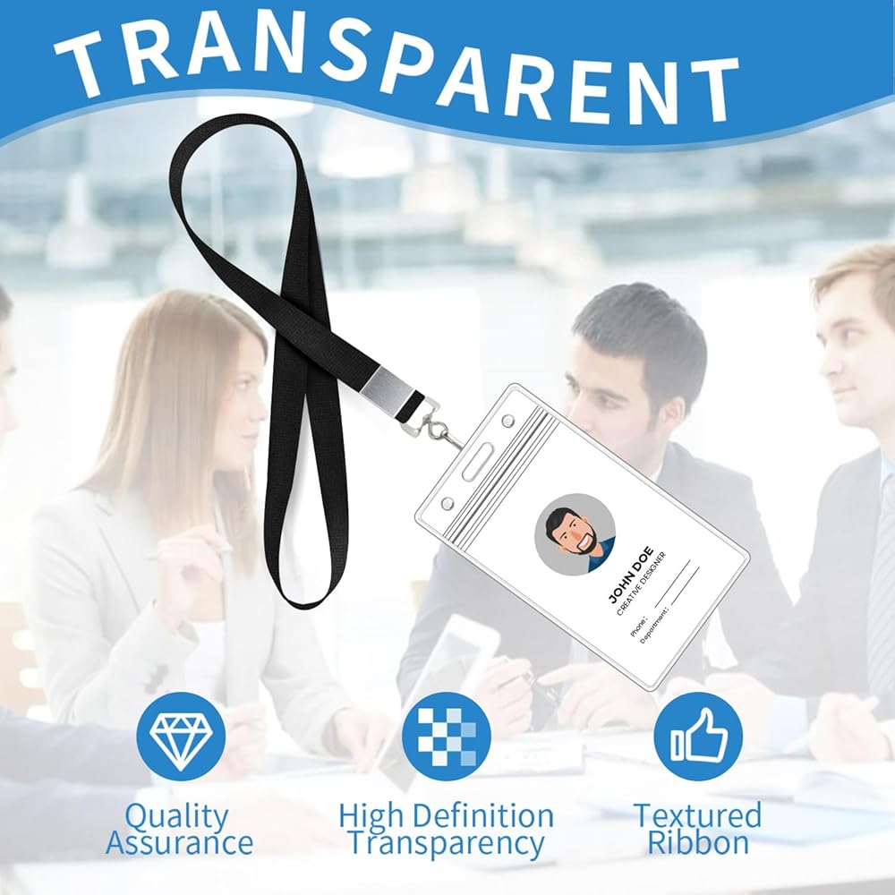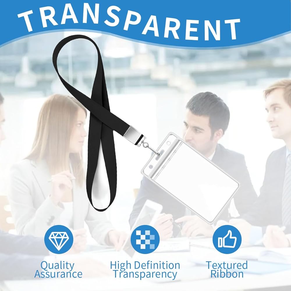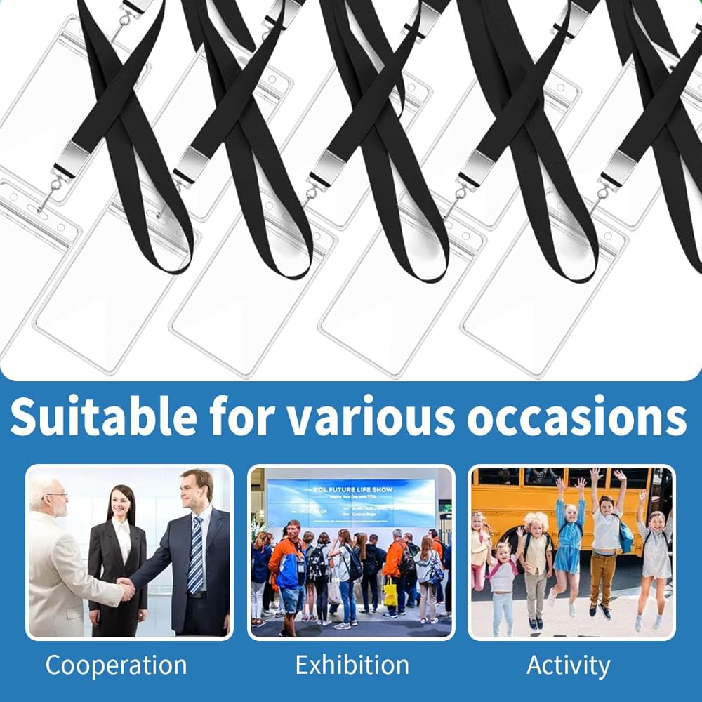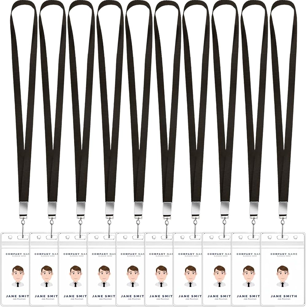 10 عبوات من الحبال السوداء مع حامل شارة واضحة، حبل للرقبة مع خطاف دوار، حامل بطاقات من البولي فينيل كلوريد مع حبال لبطاقات الهوية المقاومة للماء، حامل لبطاقات الهوية، أشرطة مكتبية مع حامل شارة هوية عمودية