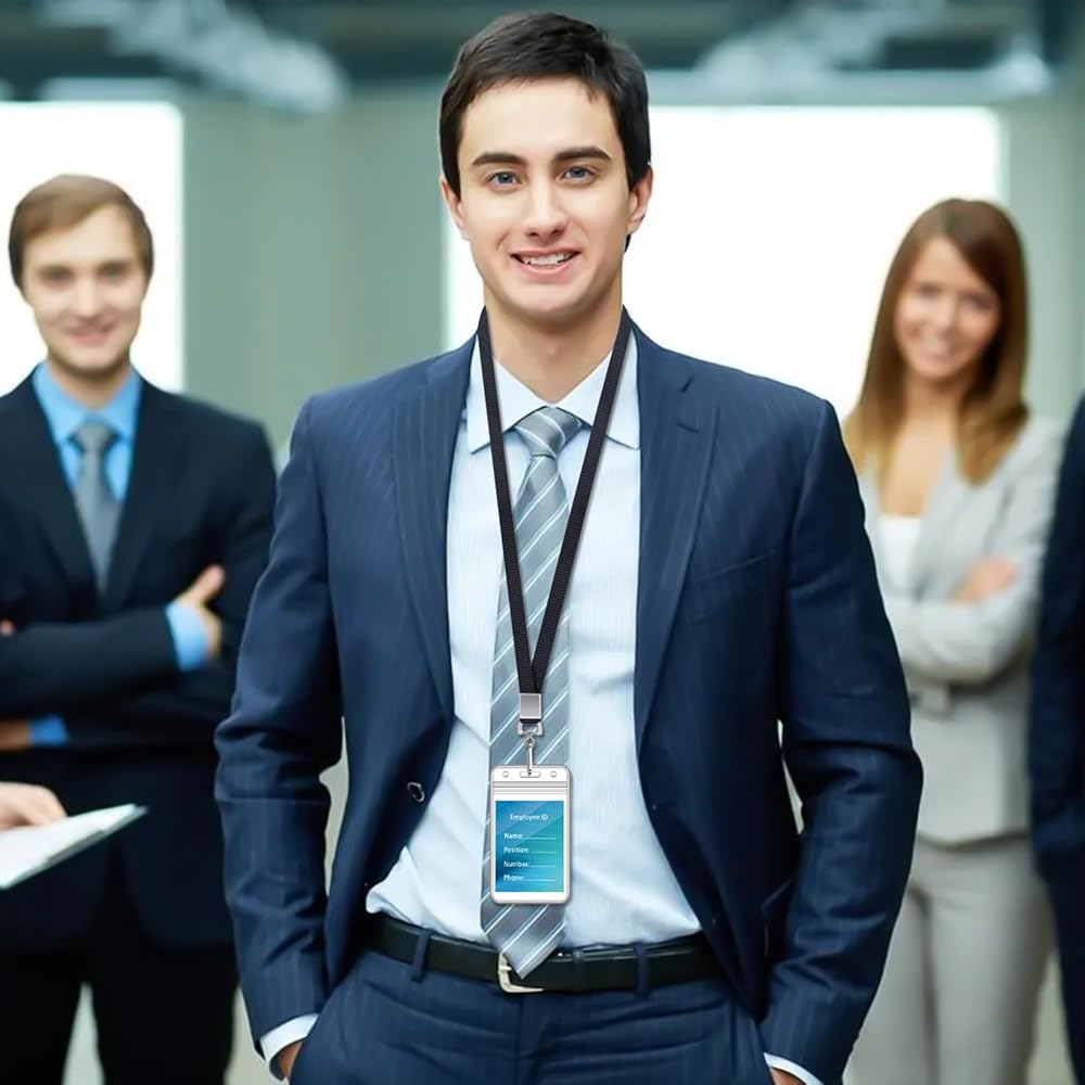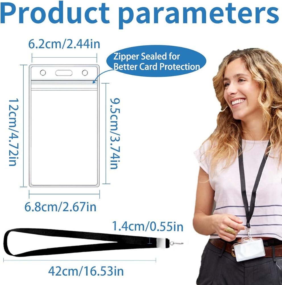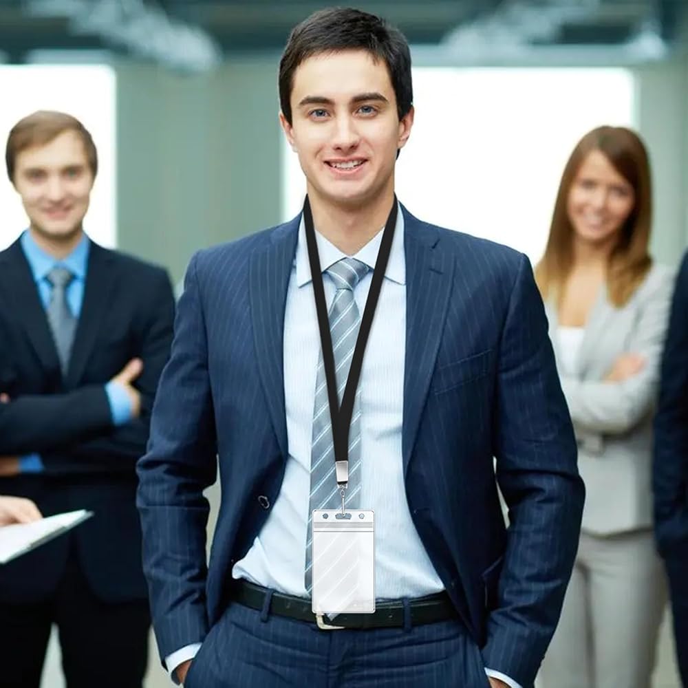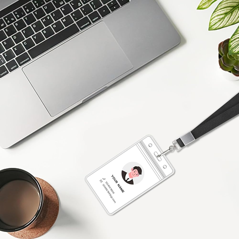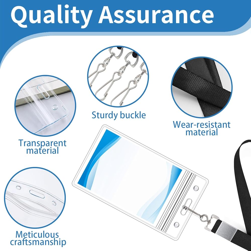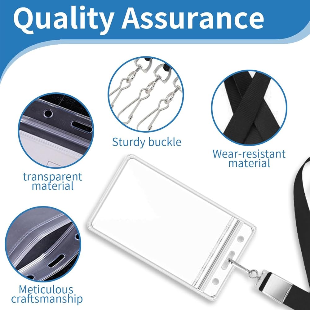 10 عبوات من الحبال السوداء مع حامل شارة واضحة، حبل للرقبة مع خطاف دوار، حامل بطاقات من البولي فينيل كلوريد مع حبال لبطاقات الهوية المقاومة للماء، حامل لبطاقات الهوية، أشرطة مكتبية مع حامل شارة هوية عمودية