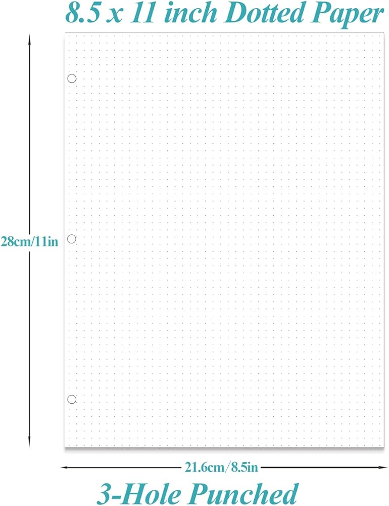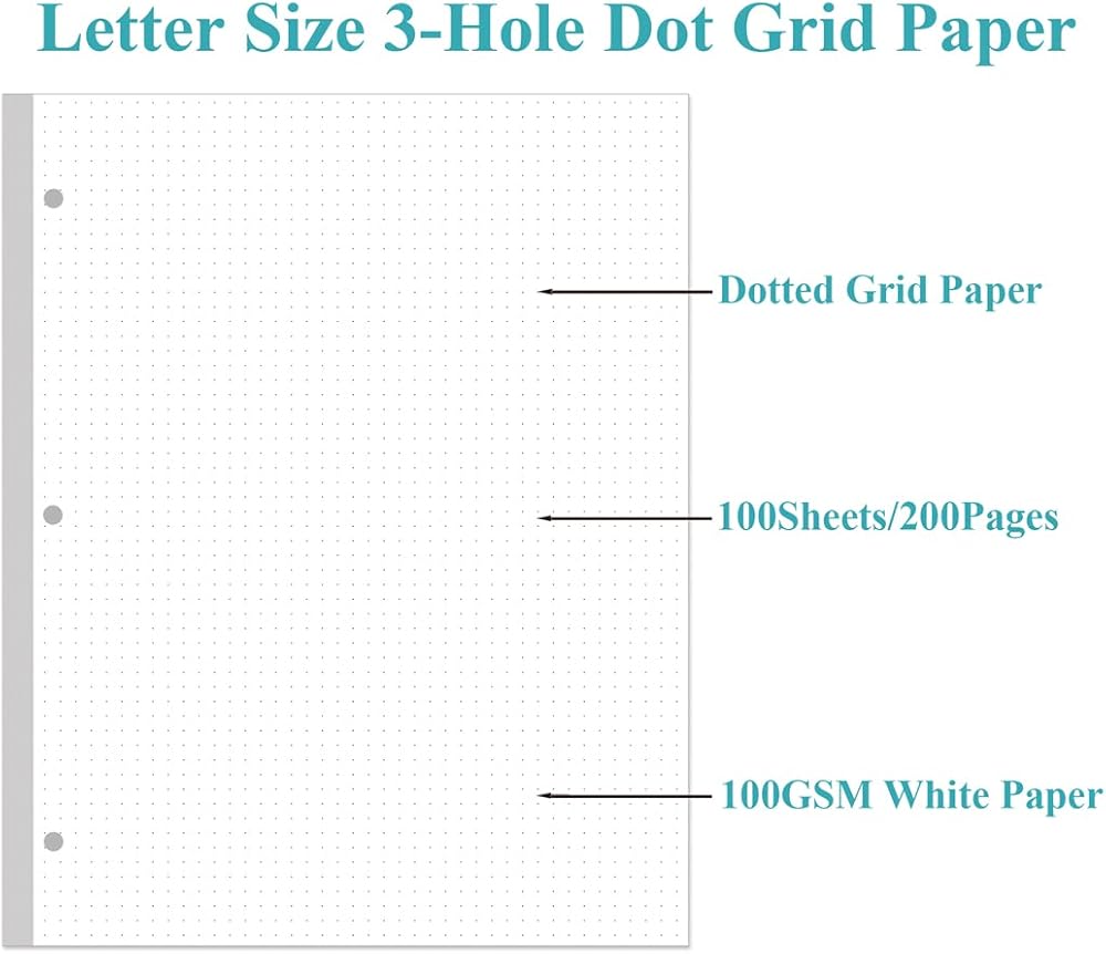 This dotted grid paper size of 8.5" x 11", 5mm apart dot grid, double side clear black dotted. This dotted filler paper with 100 sheets/200 pages for 200 days, improve your productivity with this daily organizer. Loose leaf bullet paper for standar 7-hole/3-hole inserts, refill paper for A4 binder, Size 5, Folio Size etc, DON'T fit 6 ring binders. Refill grid paper is used to high quality 100gsm pure white premium acid-free paper, so you can confidently use most pens, pencils, and markers without ghosting and bleed-through. This refill dotted grid paper for school notes, meeting notes, or any form of writing, our ruled sheets have subtle gray lines spaced by a quarter inch.