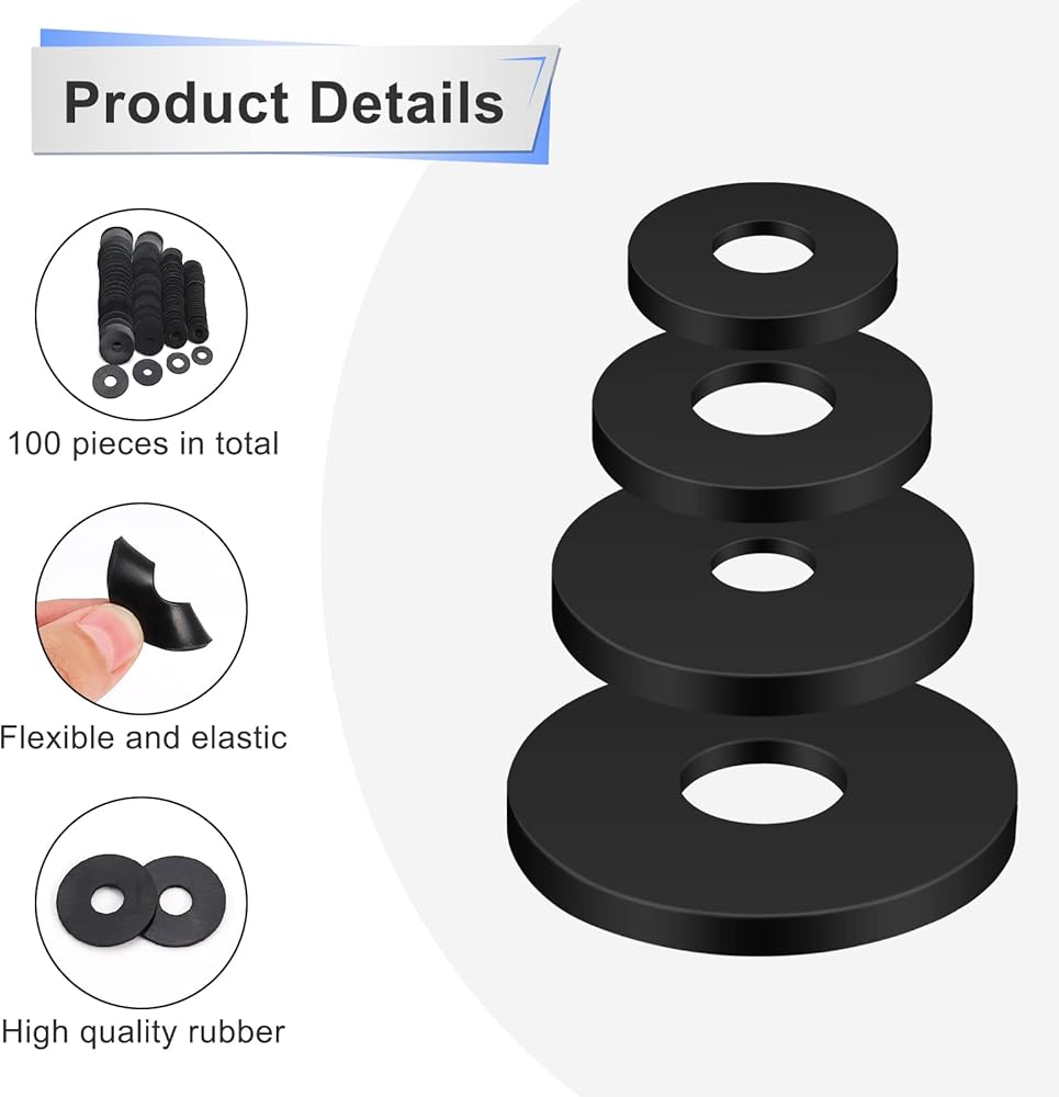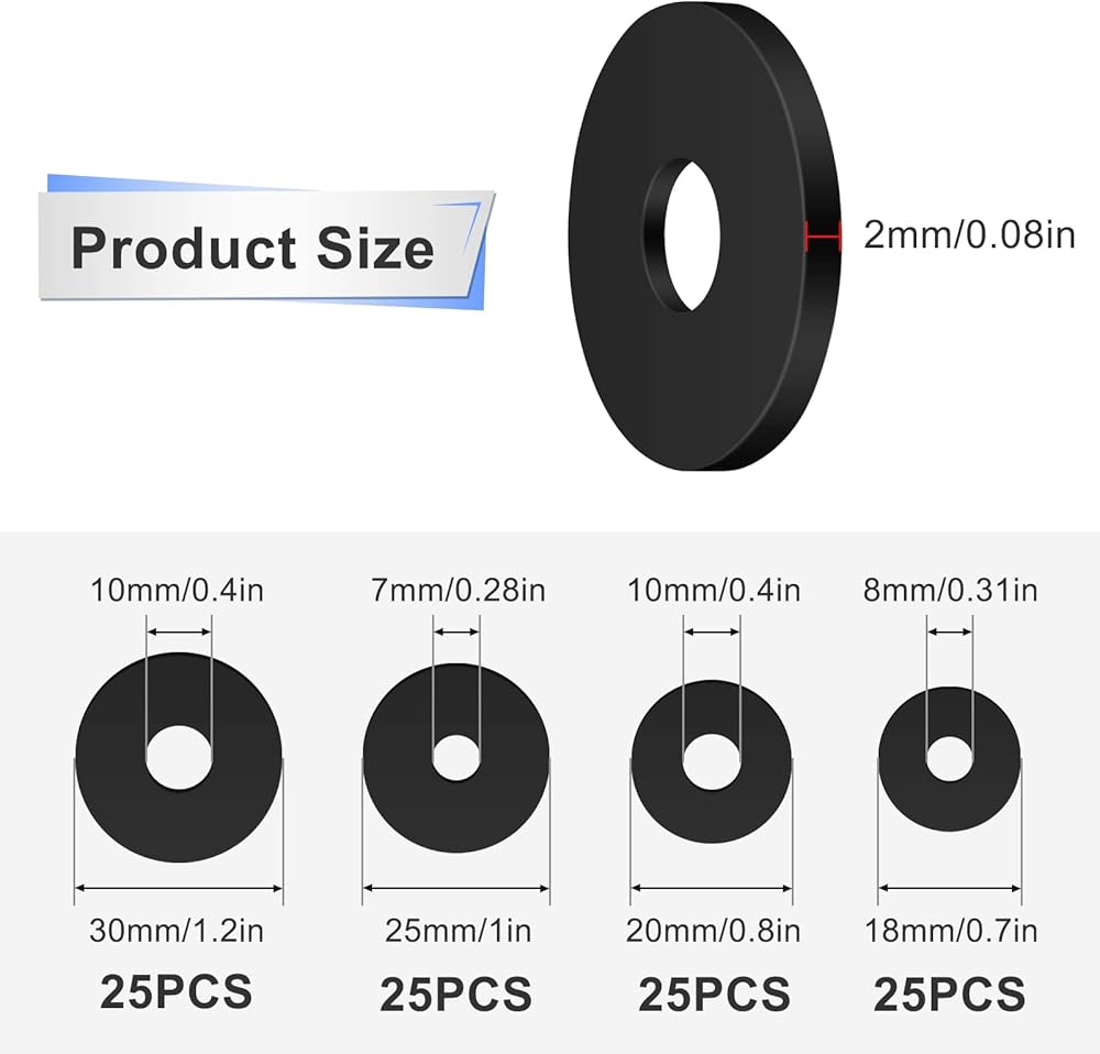 • العبوة والحجم: سوف تحصل على 100 قطعة من الغسالات المطاطية المسطحة السوداء في 4 مقاسات، 25 قطعة لكل مقاس، بما في ذلك 18 × 8 مم/ 0.7 × 0.31 بوصة، 20 × 10 مم/0.8 × 0.4 بوصة، 25 × 7 مم/1 × 0.28 بوصة بوصة، 30 × 10 مم/1.2 × 0.4 بوصة (OD × ID) ويبلغ سُمك كل غسالة مطاطية حوالي 2 مم/0.08 بوصة. يكفي لاحتياجاتك من الاستخدام اليومي والاستبدال.
