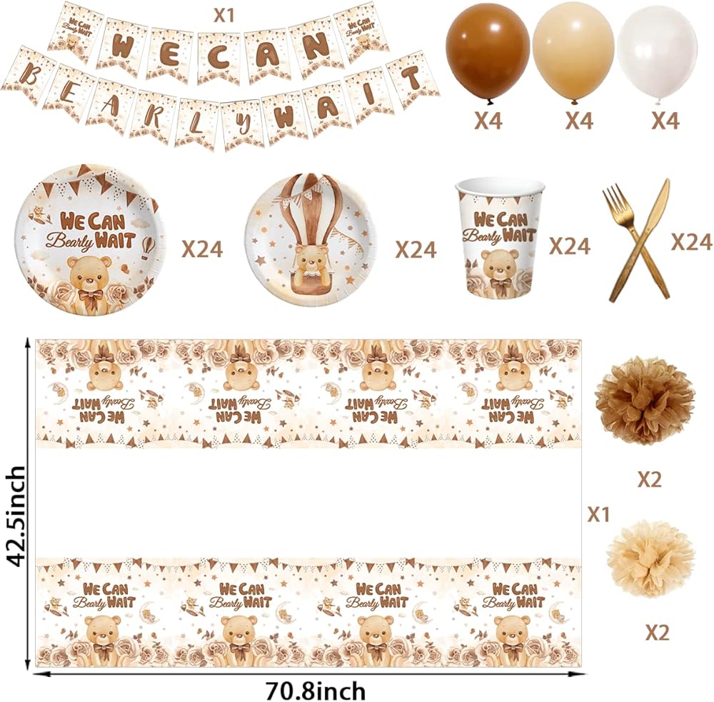 【مجموعة تزيين الدب المحايد】سوف تحصل على 114 قطعة من زينة حفلات استقبال المولود الجديد، بما في ذلك قطعة واحدة لافتة "WE CAN" "BEARLY WAIT"، وقطعة واحدة من مفرش طاولة الدب البني مقاس 70.8 × 42.5 بوصة، وإمداد لمرة واحدة لـ 24 ضيفًا من أدوات المائدة (بما في ذلك 24 قطعة 9) "طبق دب بني، 24 قطعة طبق دب بني مقاس 7 بوصات، 24 قطعة كوب ورقي على شكل دب بني 9 أونصة، 24 قطعة سكين، 24 قطعة شوكة)، 4 من كل نوع من 3 أنواع من البالونات بألوان مختلفة، و2 من كل نوعين من الكرات الورقية المختلفة. الألوان.