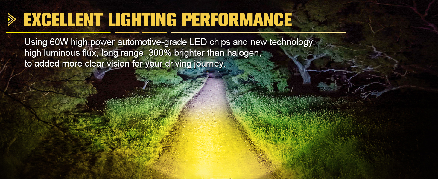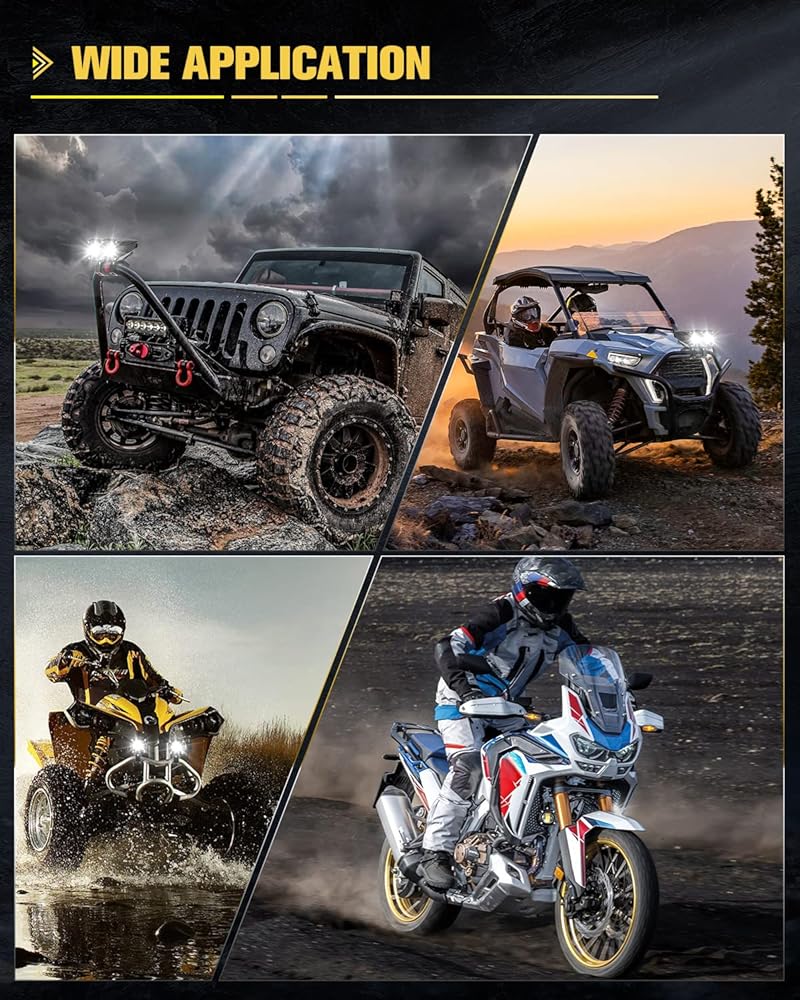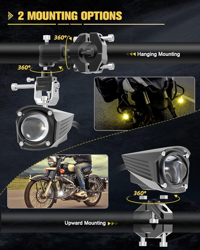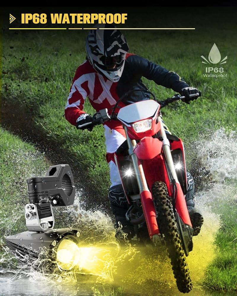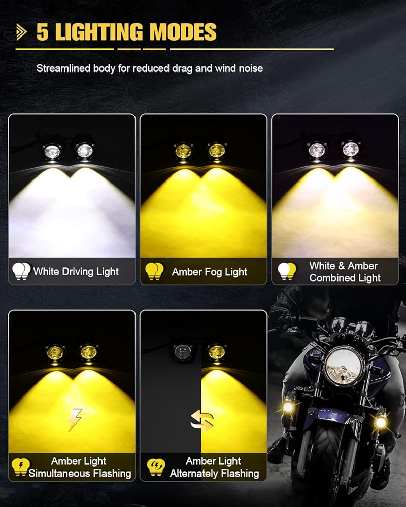 خمسة أوضاع إضاءة: تتميز عن غيرها من مصابيح قيادة الدراجات النارية بنفس السعر مع وضع إضاءة واحد أو وضعين فقط، مصابيح الضباب LED للدراجة النارية CO LIGHT لها 5 أوضاع إضاءة: ضوء كشاف أبيض (شعاع عالٍ مع 6500K 3000LM)، ضوء ضباب كهرماني (شعاع منخفض مع 3000K 2400LM)، ضوء أبيض + كهرماني (شعاع مشترك)، وميضان متزامنان، ومصباحان يومضان بالتناوب.