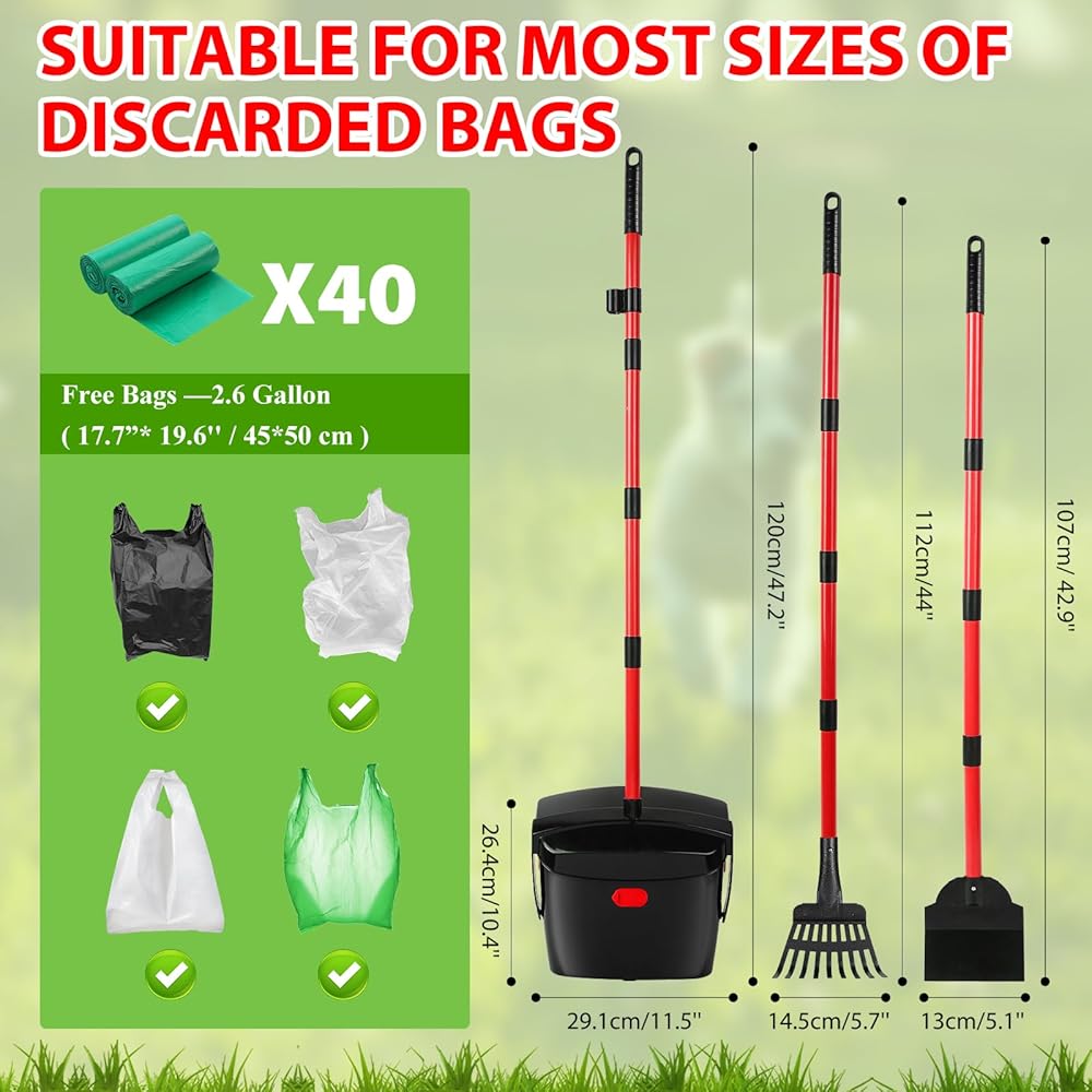 مغرفة مخلفات الكلاب الكبيرة شديدة التحمل، مغرفة مخلفات الكلاب للكلاب الصغيرة المتوسطة مع مقبض طويل لتنظيف نفايات الحيوانات الأليفة، سلة دوارة ومجرفة ومجرفة مع 40 كيس نفايات للساحات الخارجية (أحمر)