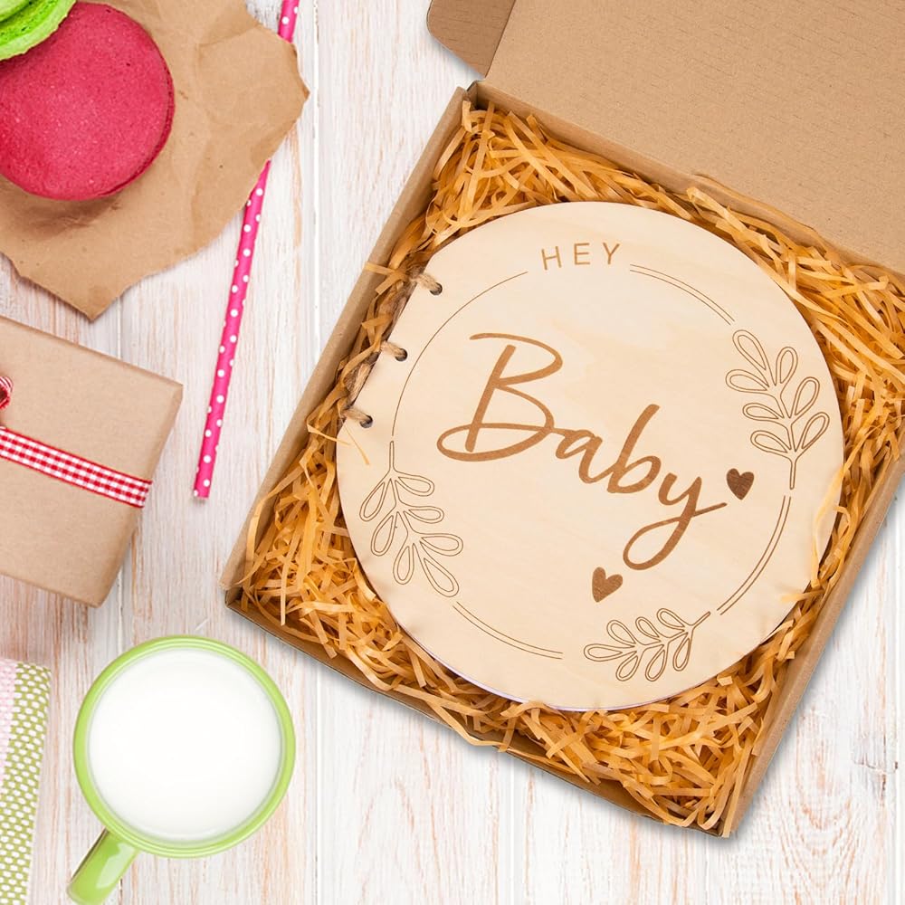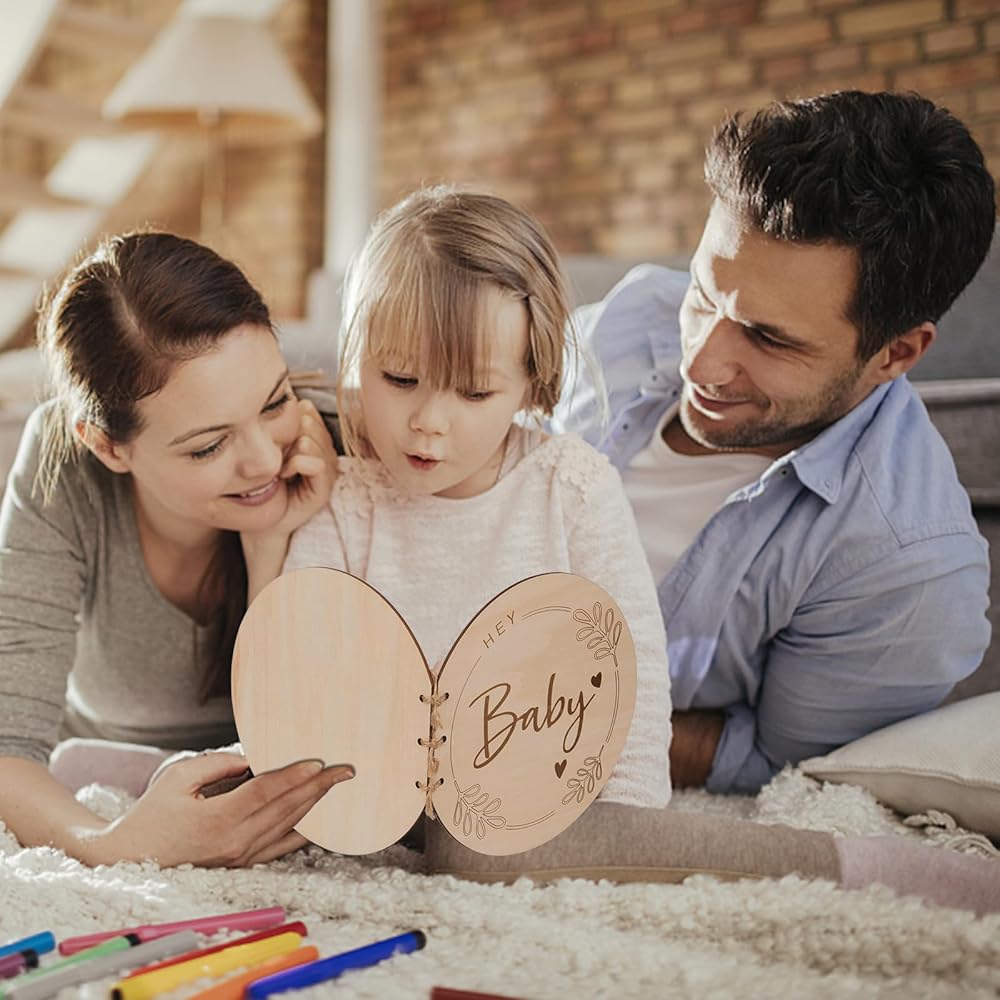 【العبوة متضمنة】 سوف تحصل على كتاب أطفال منحوت من الخشب معبأ بشكل جميل كما هو موضح في الصورة، و32 صفحة فارغة ومساحة كبيرة لجميع أحبائك لكتابة الرسائل والنصائح للآباء المستقبليين.