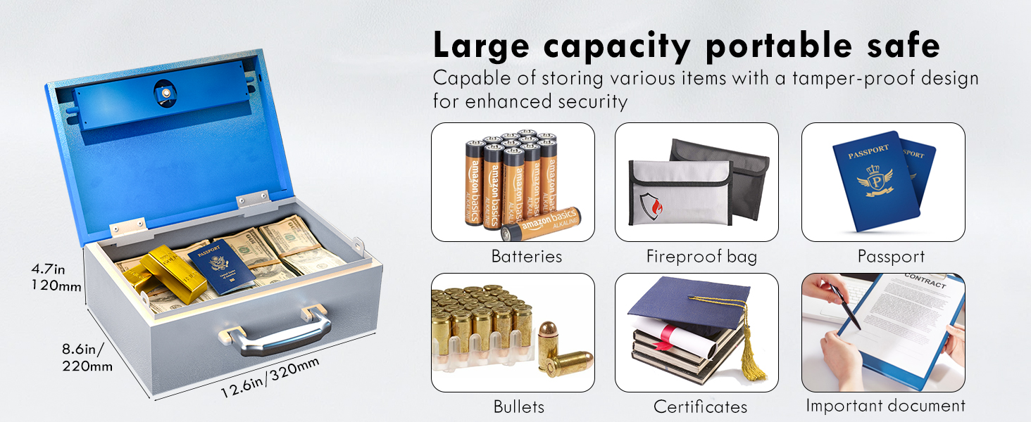 الحجم الأمثل للتخزين: بقياس 4.7 × 8.6 × 12.6 بوصة، يوفر صندوق التخزين الآمن الخاص بنا مساحة واسعة للمستندات والأشياء الثمينة الخاصة بك دون شغل مساحة زائدة.