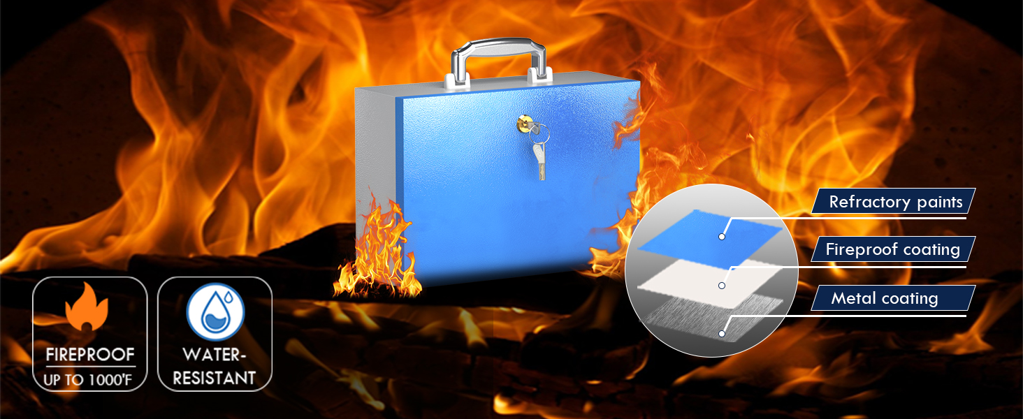 ميزة مقاومة الحريق: تم تصميم صندوق الأمان المقاوم للحريق ليتحمل درجات الحرارة المرتفعة، مما يوفر طبقة إضافية من الأمان للمستندات والأجهزة الإلكترونية الخاصة بك.