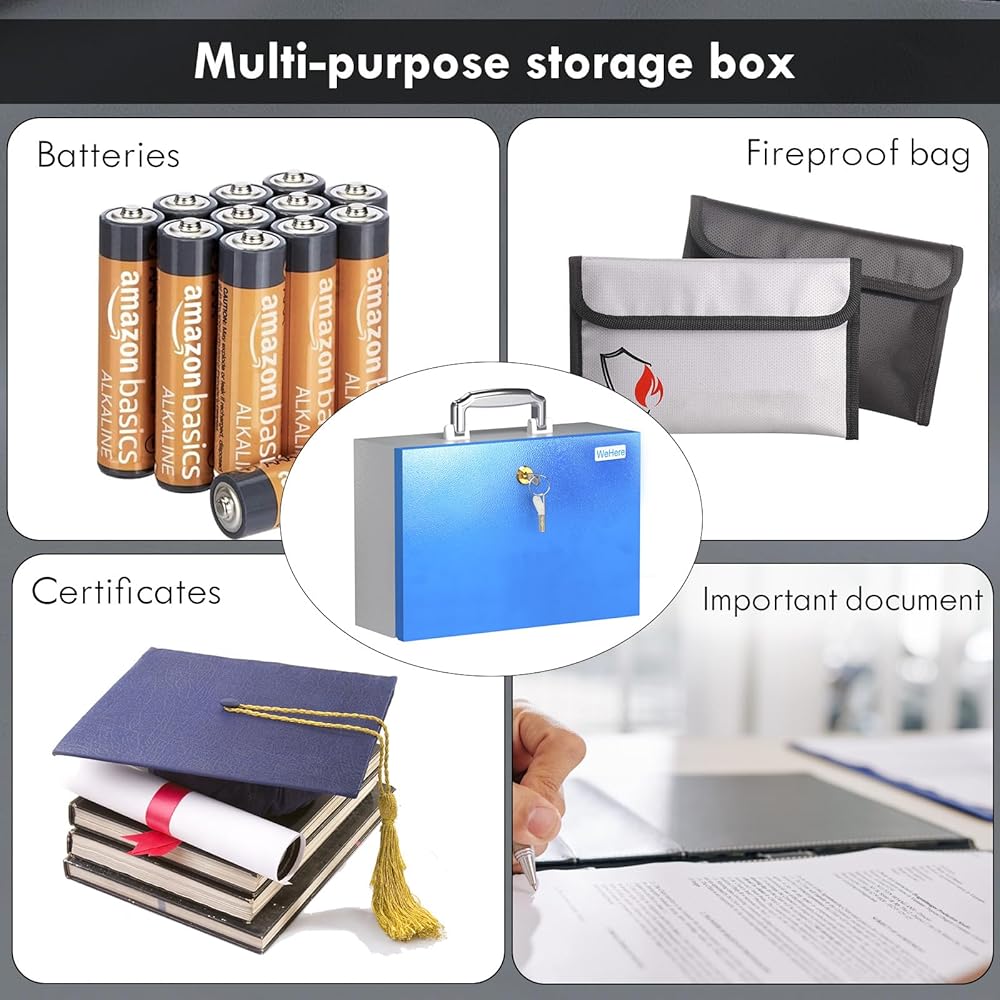 استخدام متعدد الاستخدامات: مثالي للاستخدام في المنزل أو المكتب، يمكن لصندوق المستندات المضاد للحريق تخزين مجموعة متنوعة من العناصر بما في ذلك المستندات القانونية وجوازات السفر والنقود والإلكترونيات الصغيرة، مما يبقيها آمنة ومنظمة.