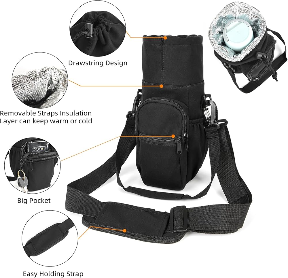 طريقتان للحمل: احمل حقيبة زجاجة المياه من خلال المقبض وحزام الكتف القابل للتعديل. المقبض وحزام الكتف لهما طبقات واسعة وسميكة؛