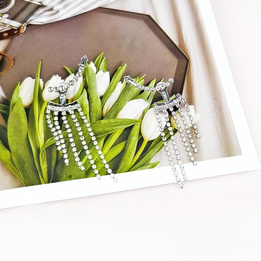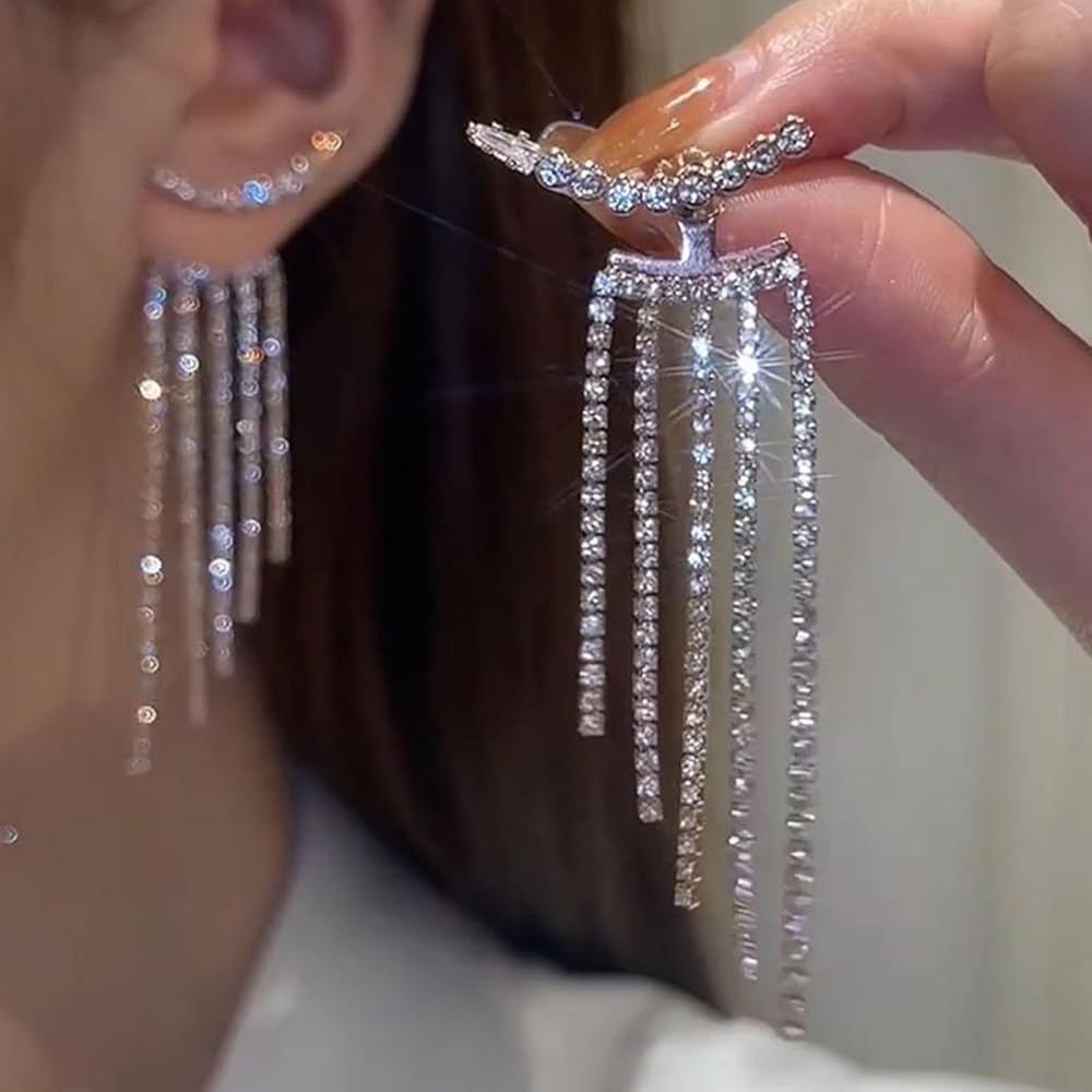أقراط شرابة فضية من حجر الراين للنساء طويلة لامعة من حجر الراين شرابة للحفلات الراقصة أقراط من حجر الراين أقراط لحفلات الزفاف والحفلات الراقصة ملابس هدايا مجوهرات
