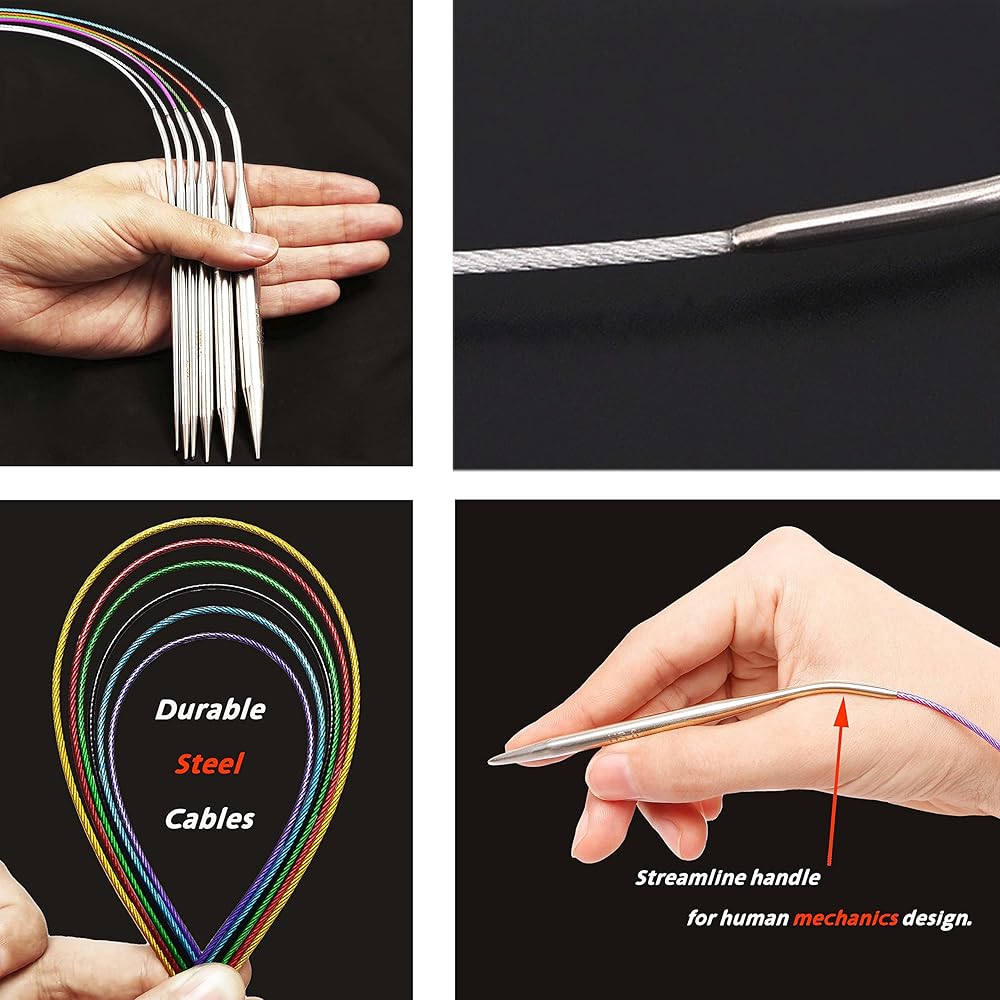 • استخدامات متعددة - باستخدام هذه الإبر، يمكنك عمل العديد من المشاريع المحبوكة، مثل القمصان بدون أكمام والأوشحة والأحذية اليدوية والسترات وهذه الإبر رائعة أيضًا للحياكة الحلقية السحرية.