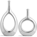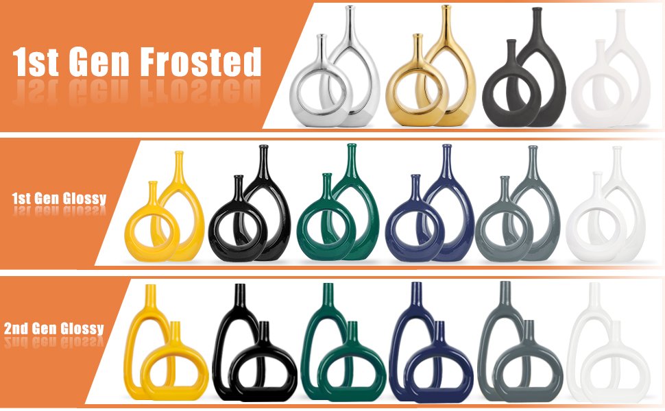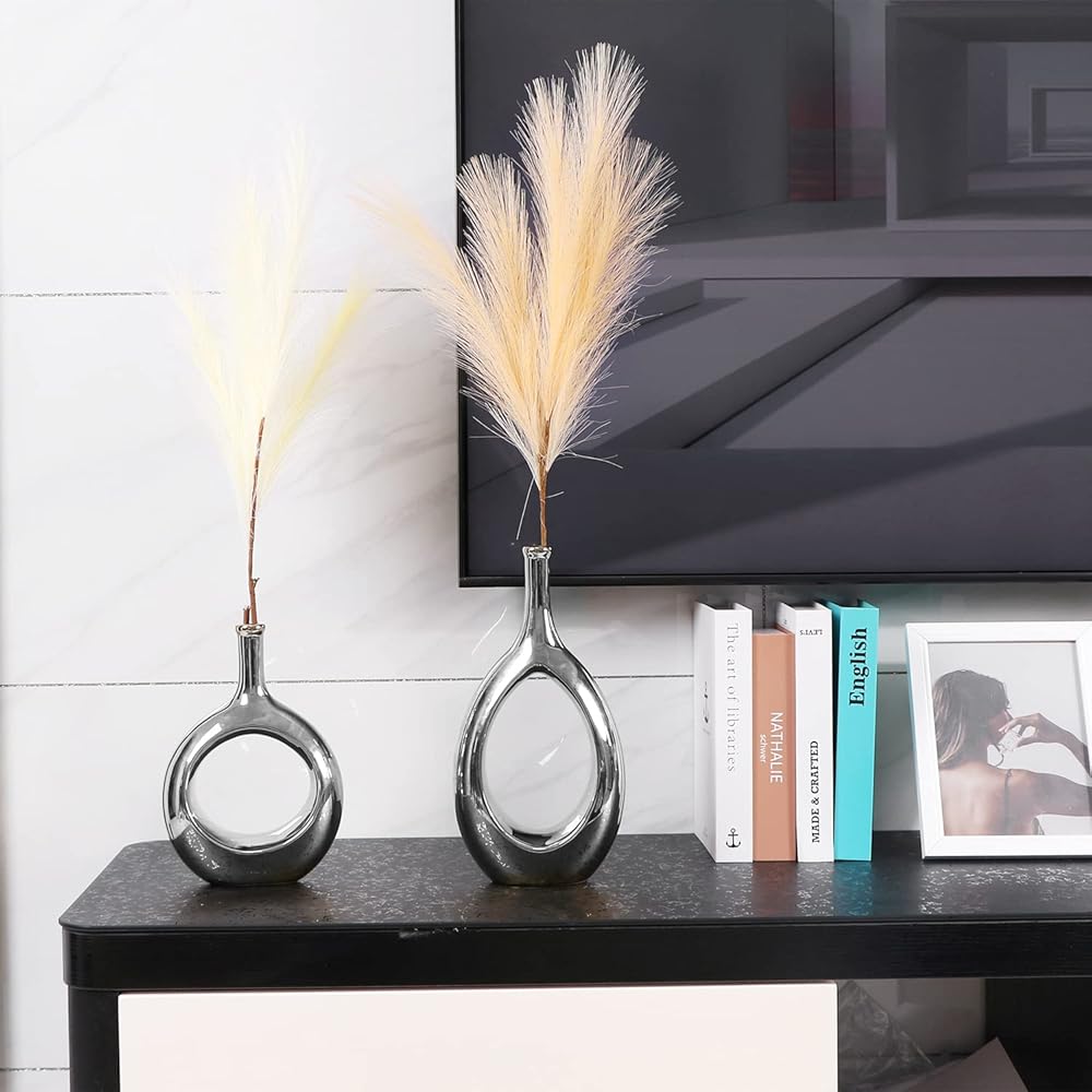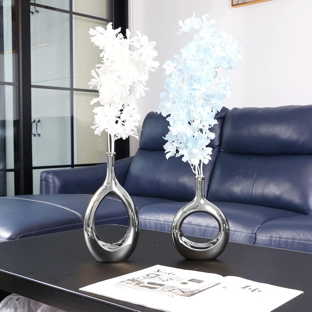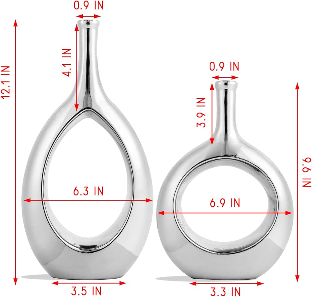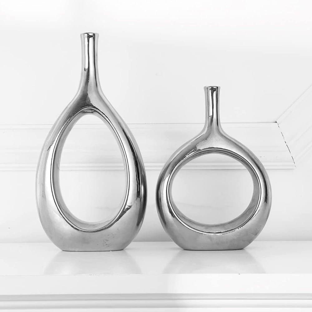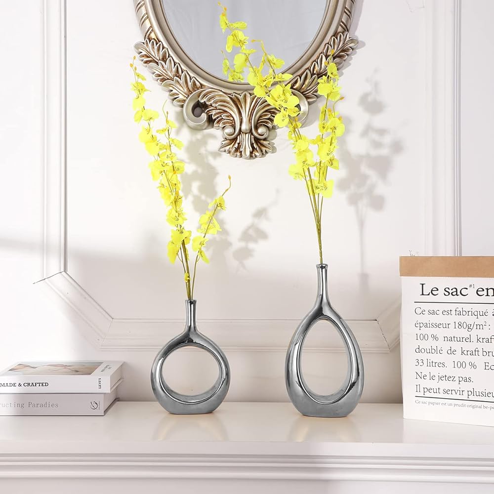 مزهرية سيراميك باللون الأسود/الأبيض/الذهبي/الفضي: مصممة بشكل بيضاوي فريد ومزهريتين مختلفتين الحجم (ارتفاع 9.3 بوصة، ارتفاع 11.8 بوصة)، مصنوعة من السيراميك عالي الجودة بنسبة 100% بخطوط جميلة. (النباتات/الزهور غير متضمنة)