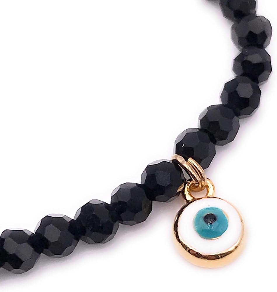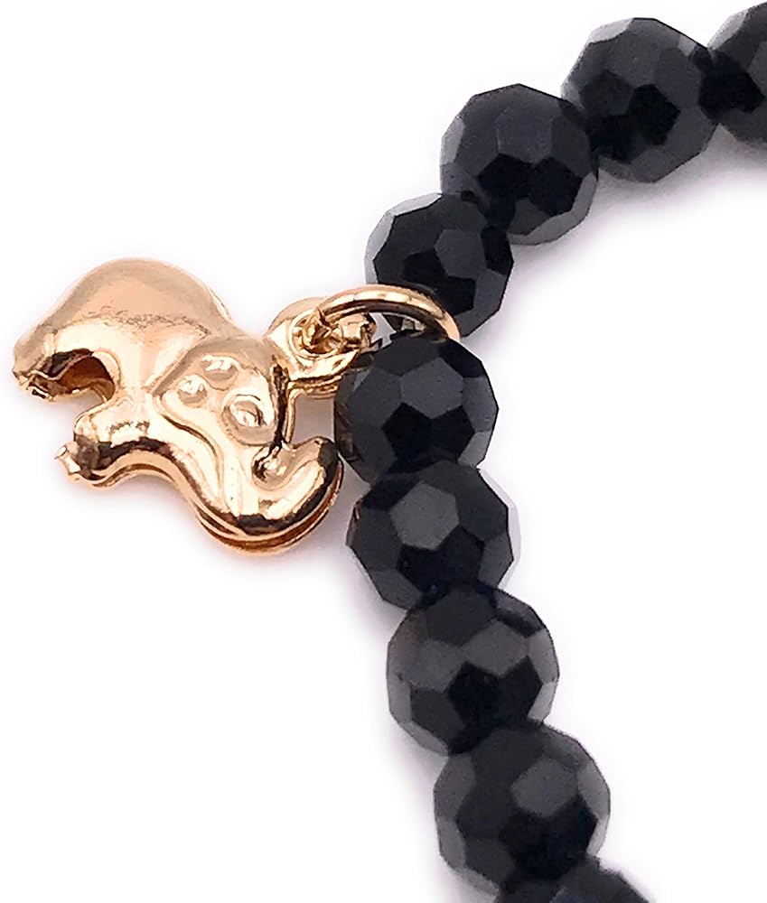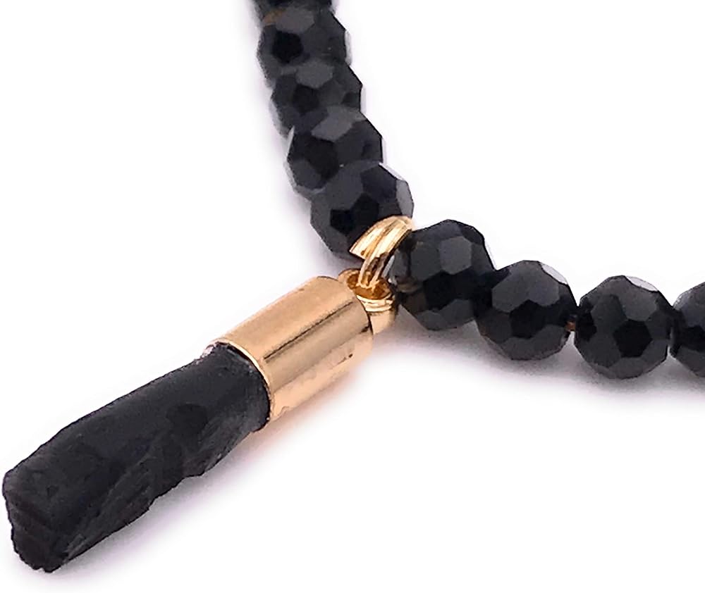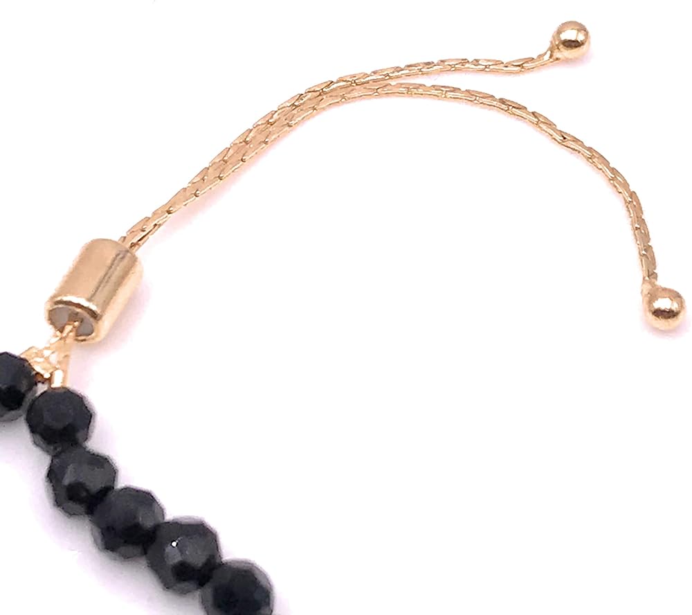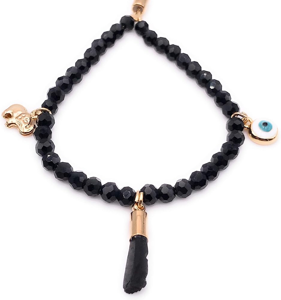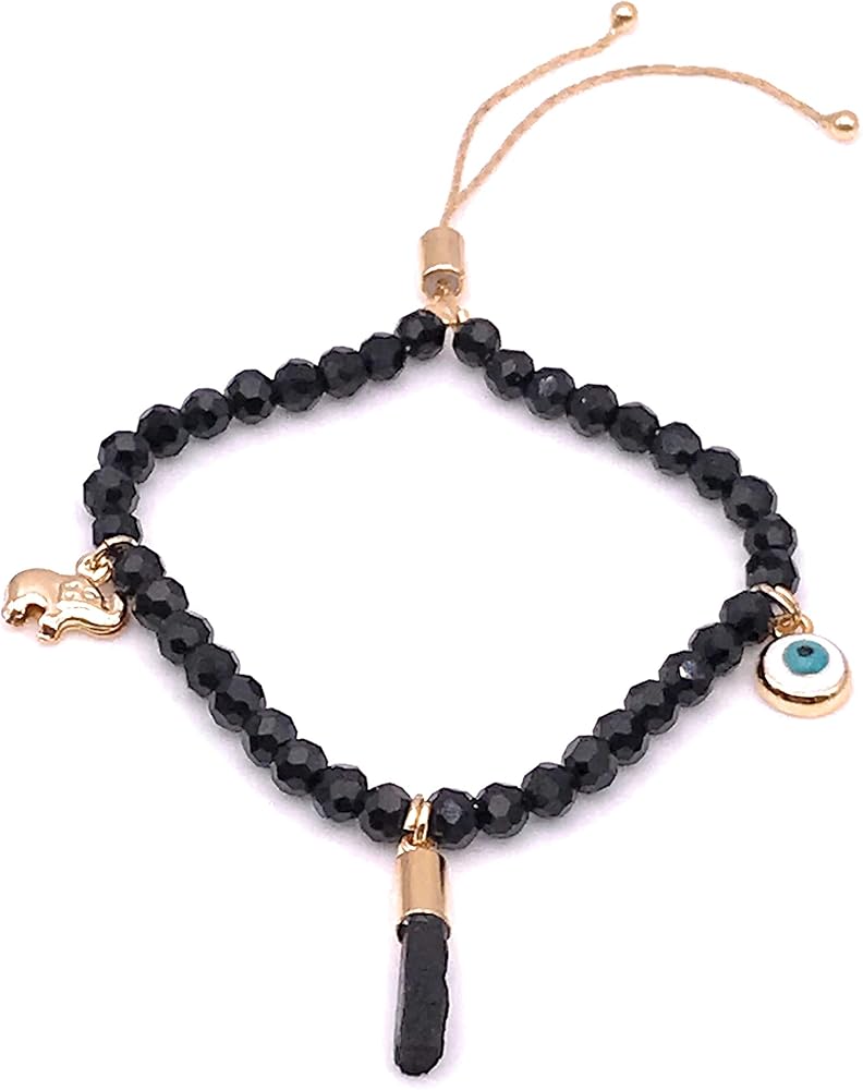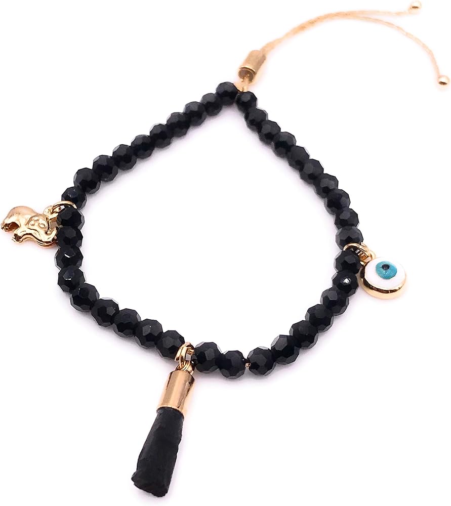 • التفاصيل: مصنوع من خرز كريستالي أسود مدرج في سلسلة ذهبية منزلقة في المنتصف ويحتوي على 3 دلايات ساحرة