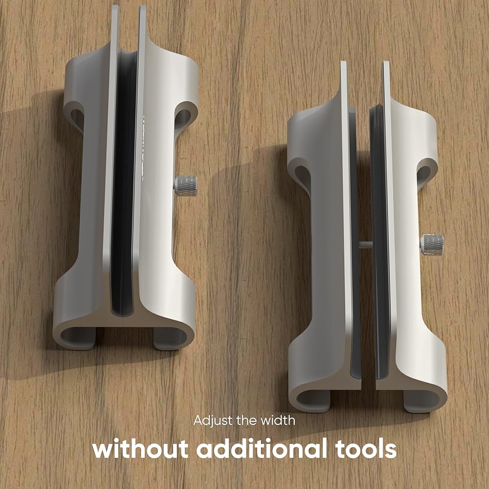 ✔️ عرض قابل للتعديل: يسمح لك باستخدام هذا الحامل الرأسي لأجهزة الكمبيوتر المحمولة المختلفة بسمك لا يقل عن 0.5 بوصة حتى 1 بوصة. يمكن تعديل عرض حامل الكمبيوتر المحمول بسهولة عن طريق تدوير الصمولة، دون الحاجة إلى أدوات إضافية.