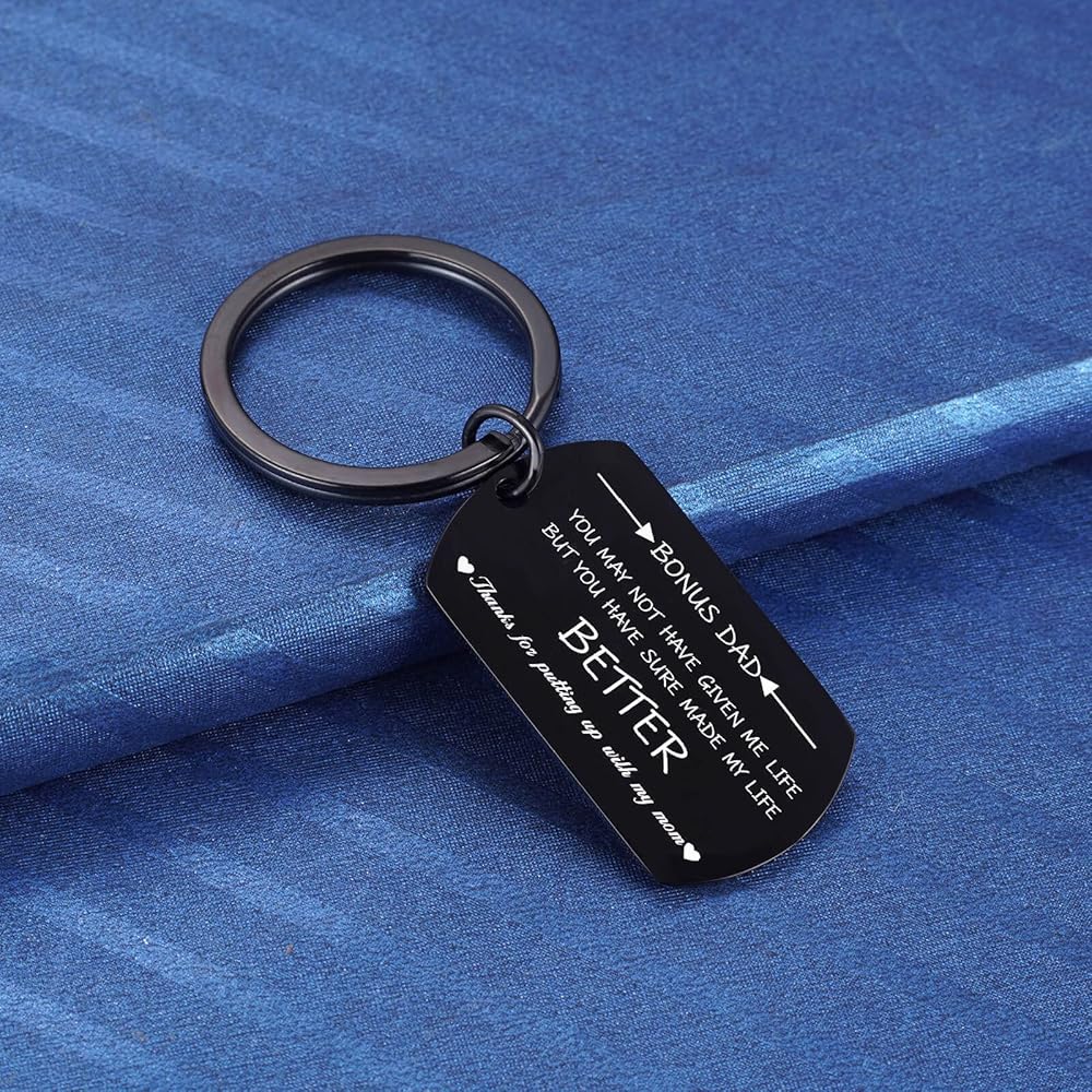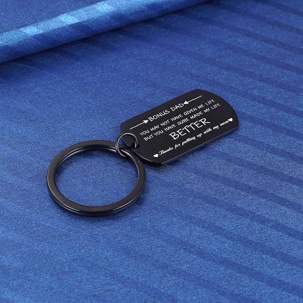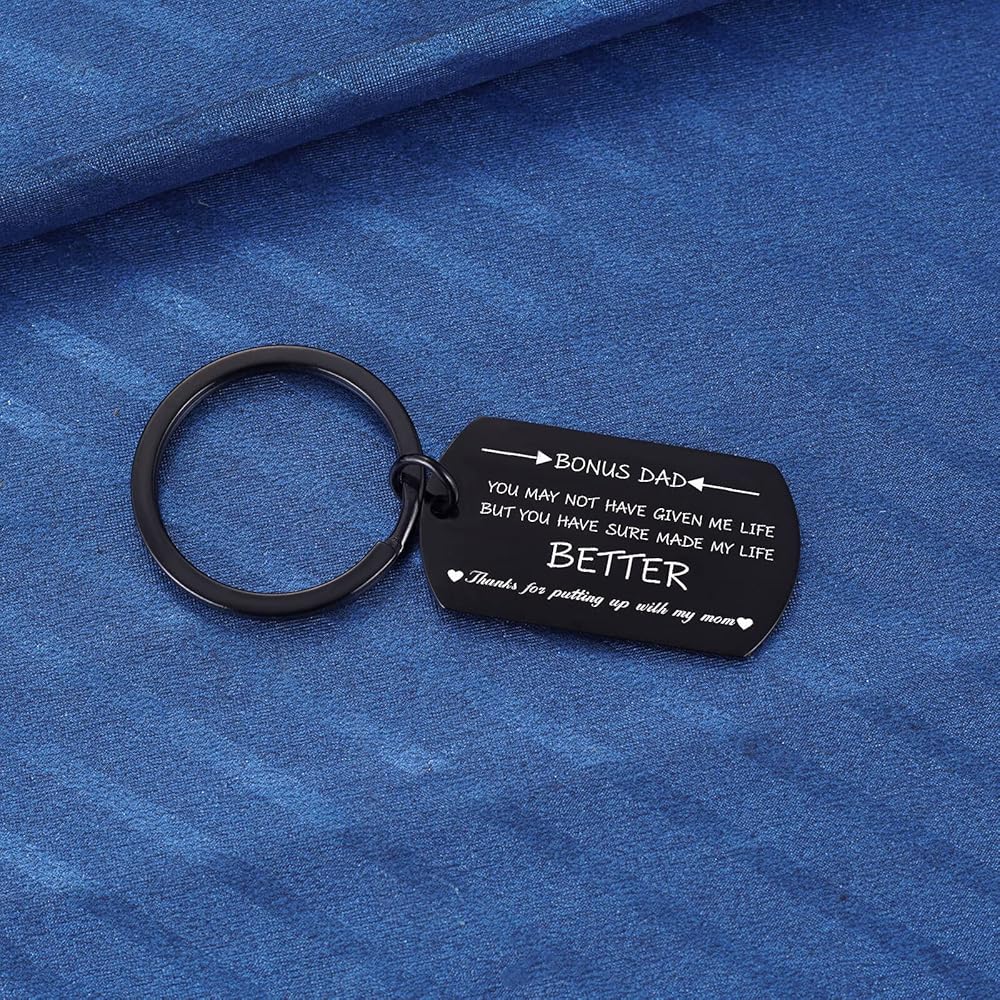 Stepdad Gifts: The keyring is engraved with "Bonus Dad, you may not have given me life, but you have sure made my life better. Thanks for putting up with my mom". It is the perfect gift for your stepfather to express your love.