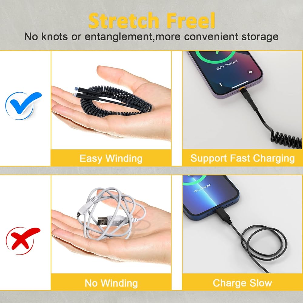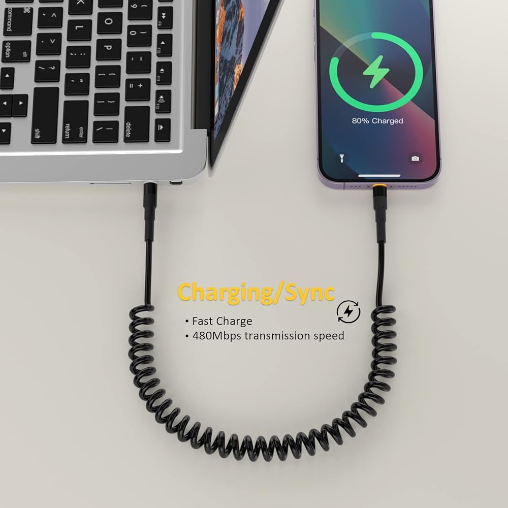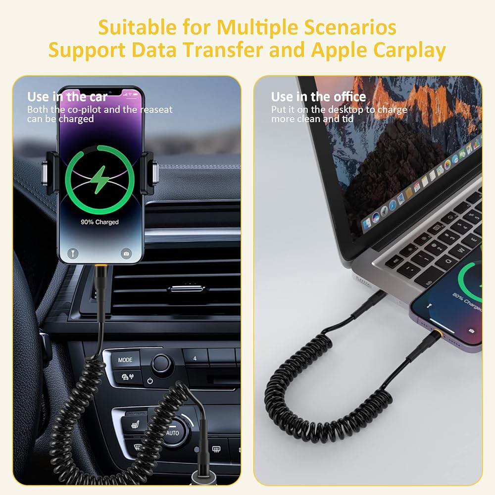 • كابل USB C Apple Carplay: يحتوي هذا الكابل الملفوف من USB c إلى Lightning على حل رائع لشحن هاتفك في السيارة ويدعم Apple CarPlay. بالإضافة إلى ذلك، فإن كابل كاربلاي طويل بما يكفي للتمدد إلى المقعد الخلفي دون أي تشابك، مما يحافظ على سيارتك أنيقة ومرتبة.