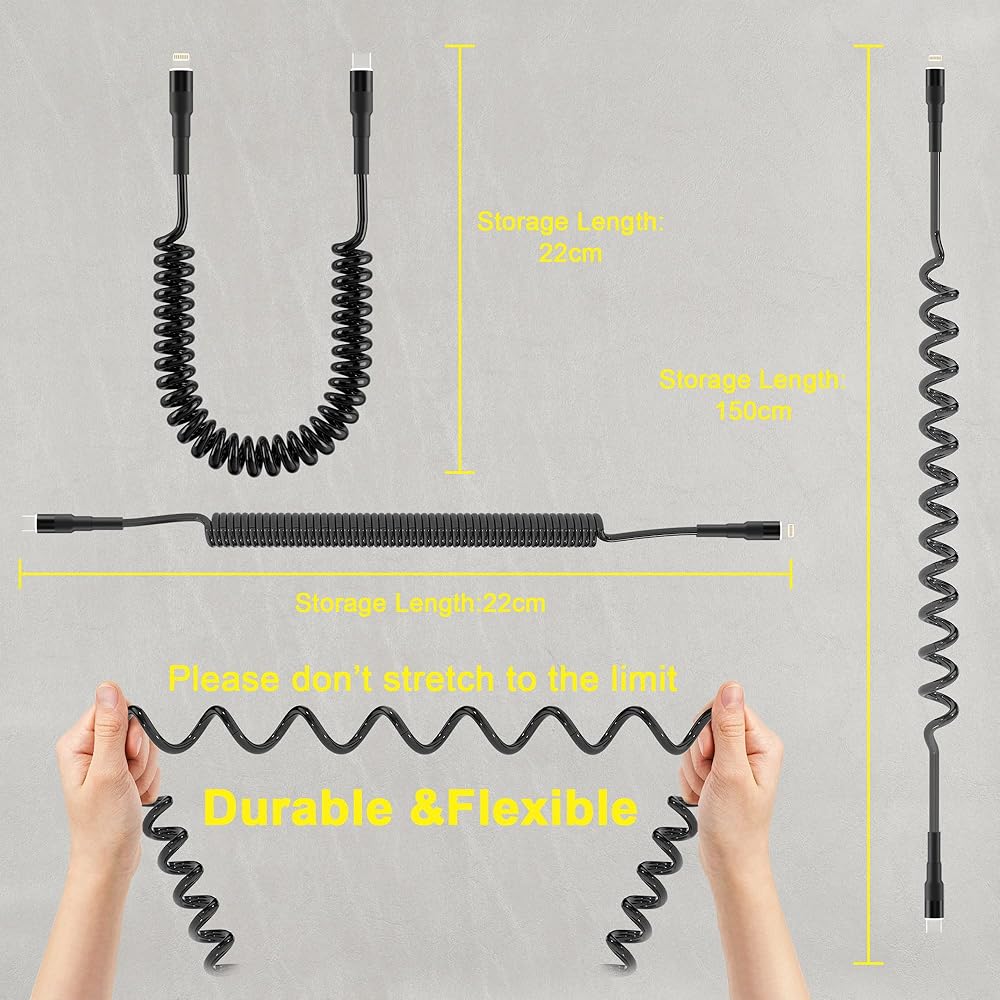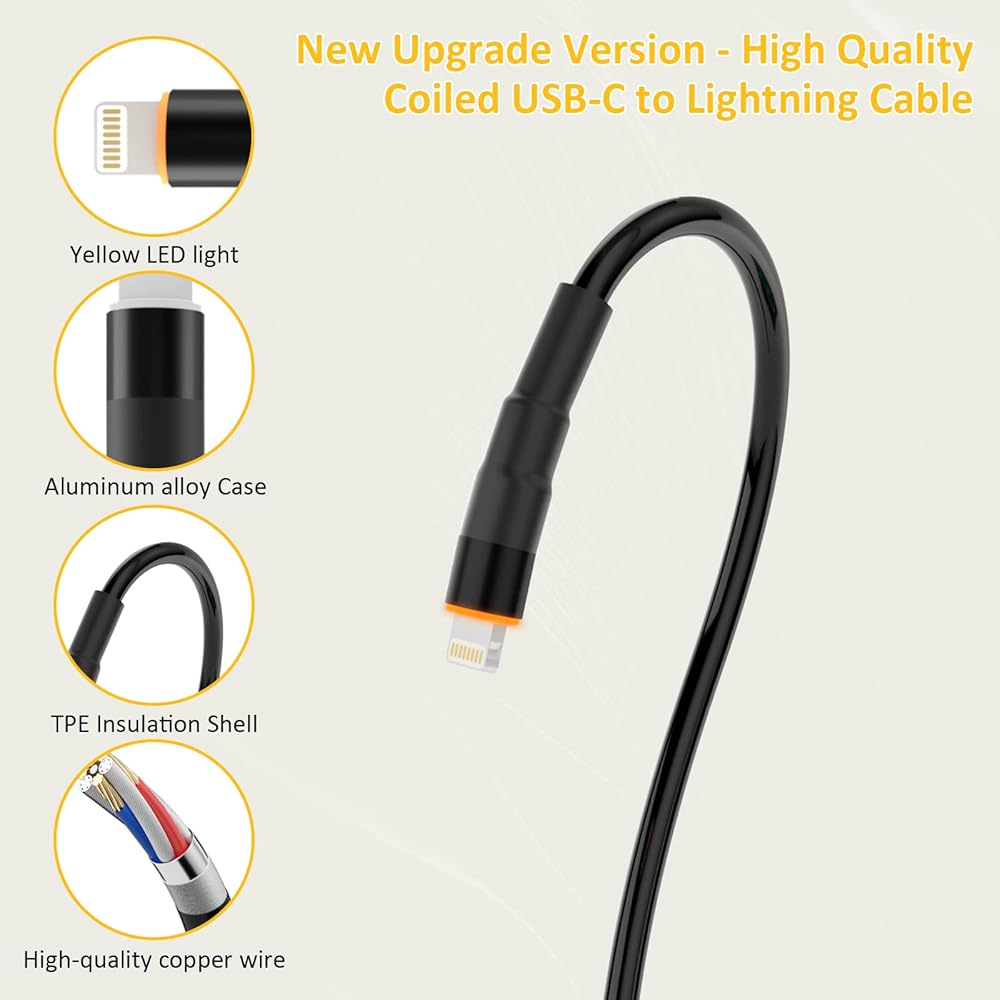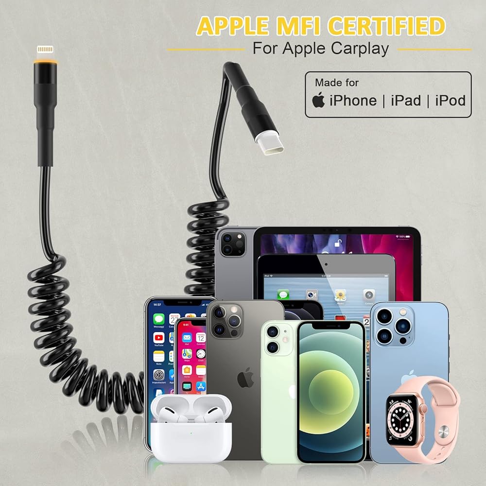 كابل USB-C إلى Lightning ملفوف، متوافق مع سلك Apple Carplay ومعتمد من MFi، كابل USB C إلى Lightning مع نقل البيانات وLED، سلك شاحن iPhone قابل للسحب USB C لأجهزة iPhone/Pad/Pod