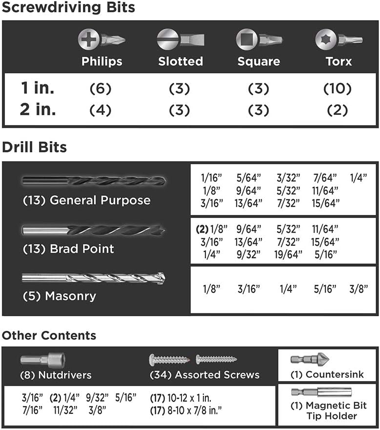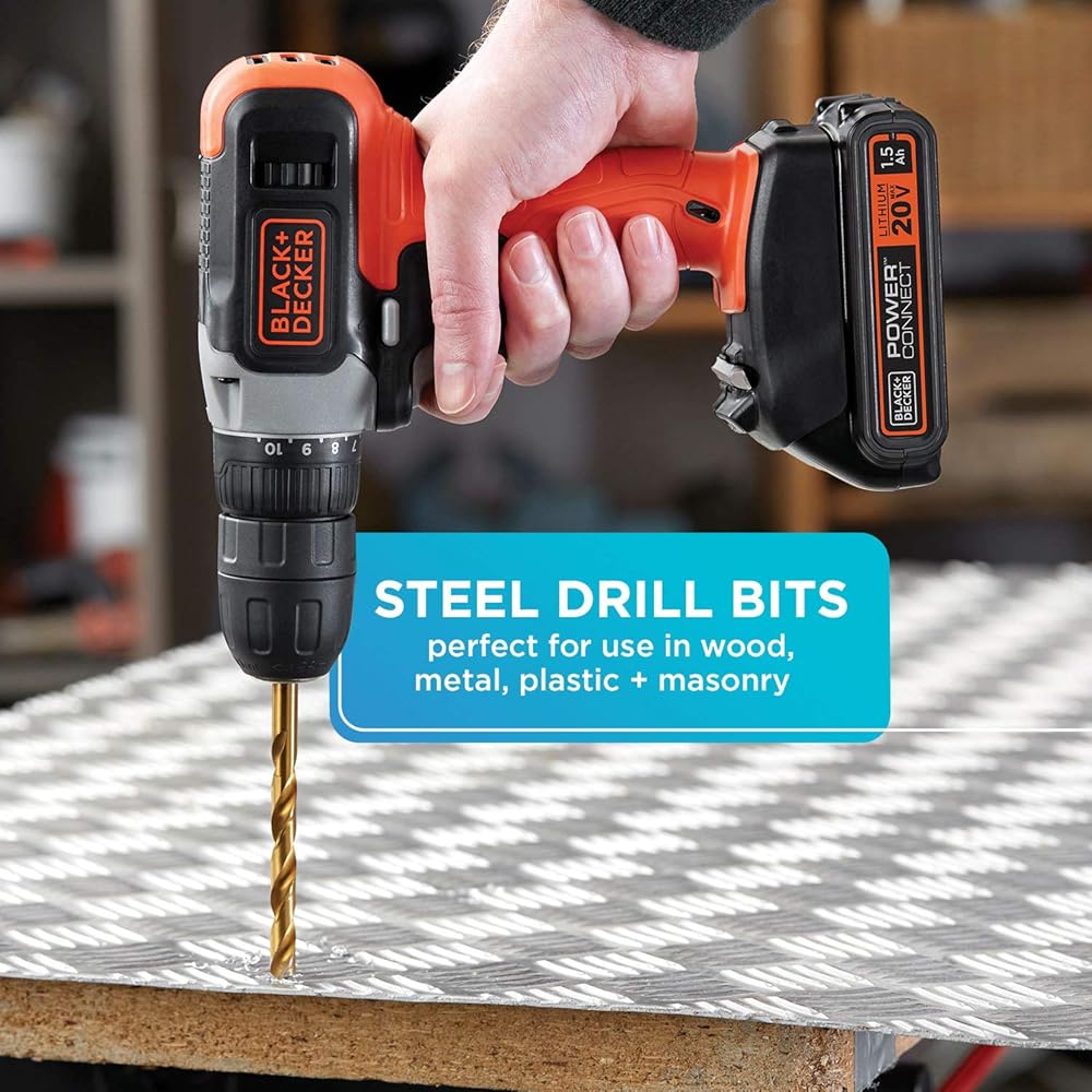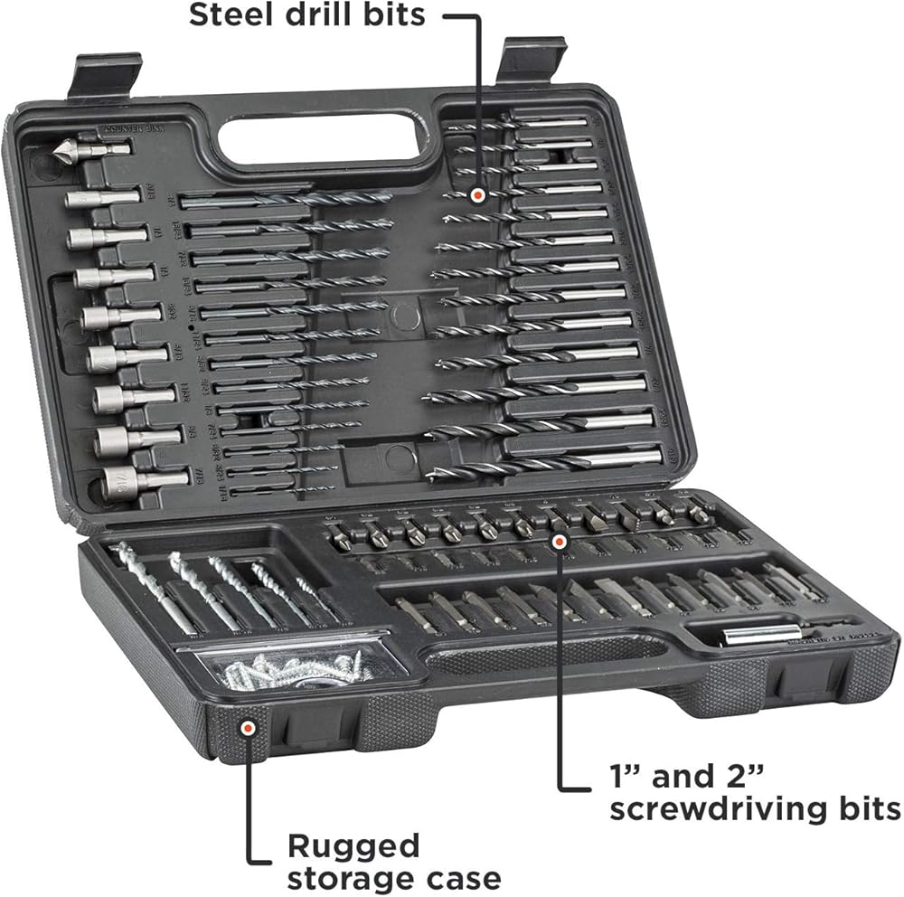 بالنسبة لأي مشروع في المنزل، فإن مجموعة الحفر والمفكات المركبة من بلاك اند ديكر (109 قطعة) موجودة لمساعدتك على القيام بالمهمة. تتضمن جميع القطع التي ستحتاجها لتعليق الصور بسهولة، وتركيب رفوف المناشف، وتجهيزات المطبخ، والستائر، والأرفف، وتجميع الأثاث والمزيد. تشتمل المجموعة على مجموعة من رؤوس لقم مفك البراغي مقاس 1 بوصة و2 بوصة وأحجام لقم الثقب الأكثر شيوعًا في علبة مشروع متينة مزودة بمزلاج إغلاق بلاستيكي ومساحة تخزين إضافية. تعتبر القطع المضمنة مثالية لمشاريع الخشب والمعادن والبلاستيك والبناء وهي ذات أحجام مثالية لمشاريع الاستخدام المتكرر والتركيب. يتضمن مجموعة متنوعة من أحجام لقم الثقب الأكثر شيوعًا للاستخدام المتكرر.