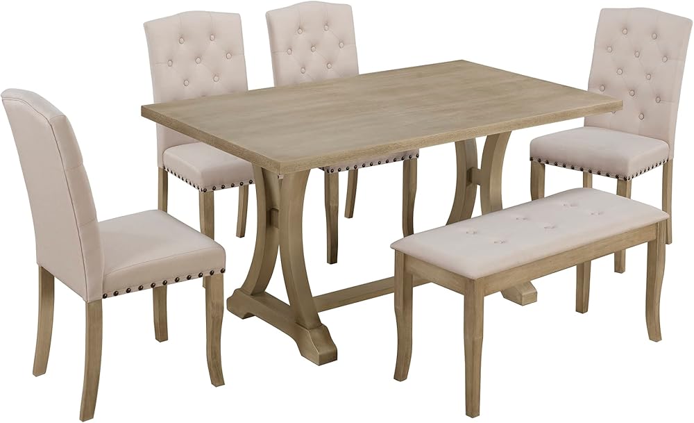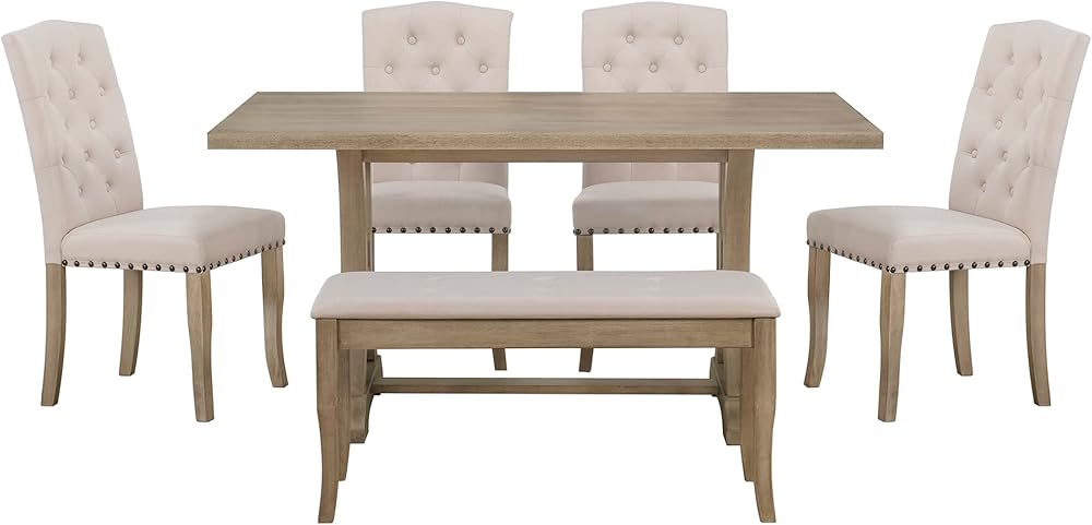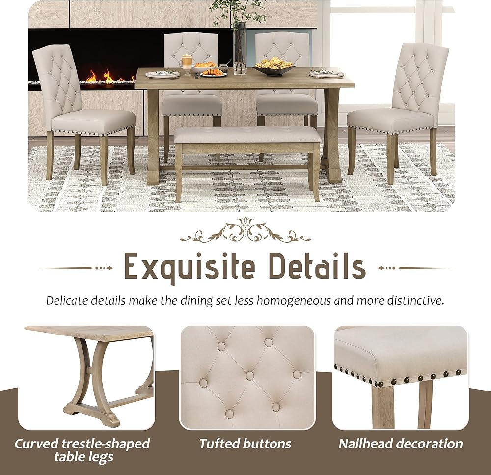 【6-Piece Farmhouse Dining Table Set】- Consisting of 1 dining table, 4 matching chairs and 1 bench, this 6-piece dining table set can perfectly accommodate your family members within no doubt and can provide a good experience for you and your family to get together. The design takes into account the sense of use and comfort. The spacious and 1.4" thick tabletop is advantageous to your placement of fruit bowls, vases, candles, etc., and you don't have to worry about its stability and capacity.