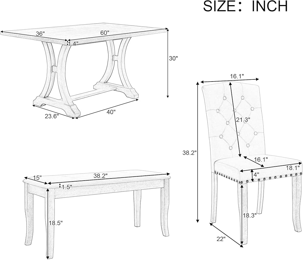 【Easy Assembly 】- Table: 60"L x 36"W x 30"H, 78.5 LBS; Chair: 18.1"L x 22"W x 38.2"H, 12.3 LBS/PCS; Bench: 38.2"L x 15"W x 18.5"H 15.4 LBS. This dining table set comes with detailed instructions, and it can be installed step by step following the instructions, which can help you complete the assembly as soon as possible. All Tools Included. ▲▲▲ Please note that A total of 2 Package BOXES may not be delivered at the same time.